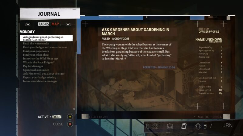 Po kliknięciu X otworzy nam się najpierw podgląd naszych cech/umiejętności, gdzie zobaczymy także postęp punktów doświadczenia – potrzebujemy 100, by osiągnąć kolejny poziom i mieć do dyspozycji jeden punkt. Następny jest ekwipunek. Podzielony on będzie na kilka części, w tym ubrania, rzeczy, które możemy trzymać w rękach (po jednym w każdej), czy przedmioty, z którymi możemy wejść w interakcję. W kolejnej zakładce znajdziemy mapę oraz podgląd zadań. To jedna z ciekawszych plansz: zadania podzielone są według dnia, kiedy trafiły na naszą listę! Przy zadaniach, które uzależnione są od konkretnego czasu, zobaczymy ikonkę zegarka. Mapa pokaże nam szkice miasteczka, a na późniejszym etapie pozwoli na szybkie przemieszczanie się pomiędzy kluczowymi miejscami. To tam znajdziemy też informacje o umiejętnościach, które będą nam potrzebne do odblokowania ścieżek rozmów z różnymi napotkanymi ludźmi.