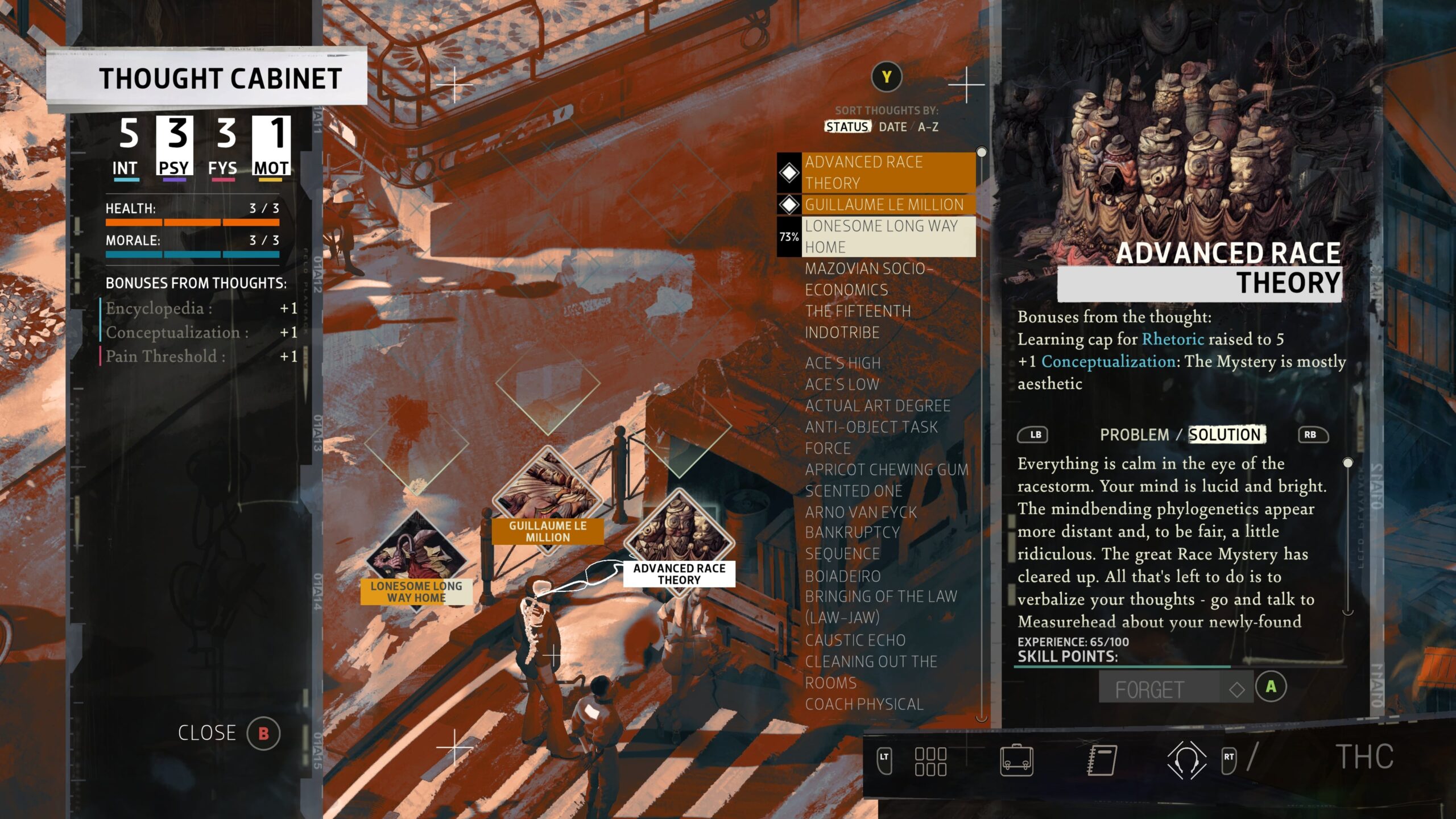 Przed startem gry, zanim jeszcze zrozumiemy cokolwiek, musimy wybrać swoją postać. A raczej, umiejętności i cechy naszego protagonisty. Do dyspozycji mamy najpierw cztery grupy (Intellect, Psyche, Physique, Motorics), a następnie milion cech i umiejętności, choć tu musimy na samym starcie wybrać jedną. Nie bójcie się — te punkty będziecie co chwilę rozwijać. Oryginalny wybór oczywiście ma spore znaczenie, bo zdeterminuje przynajmniej pierwsze wybory i sposoby na rozwiązanie napotkanych łamigłówek.