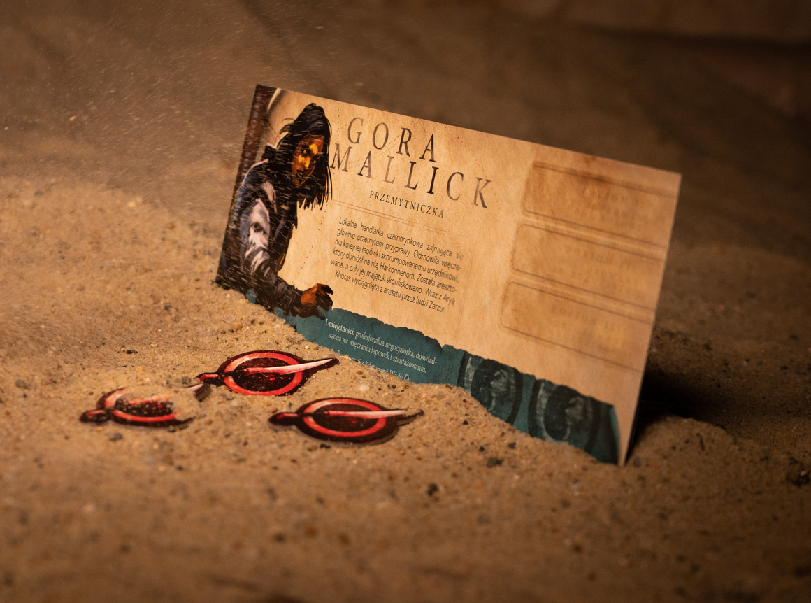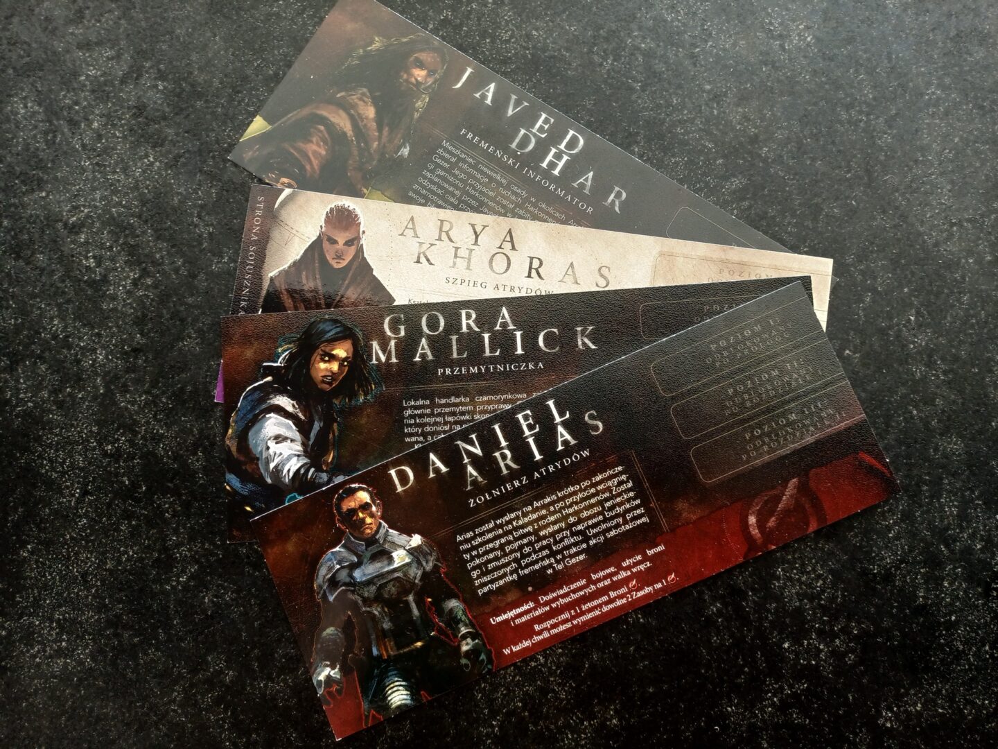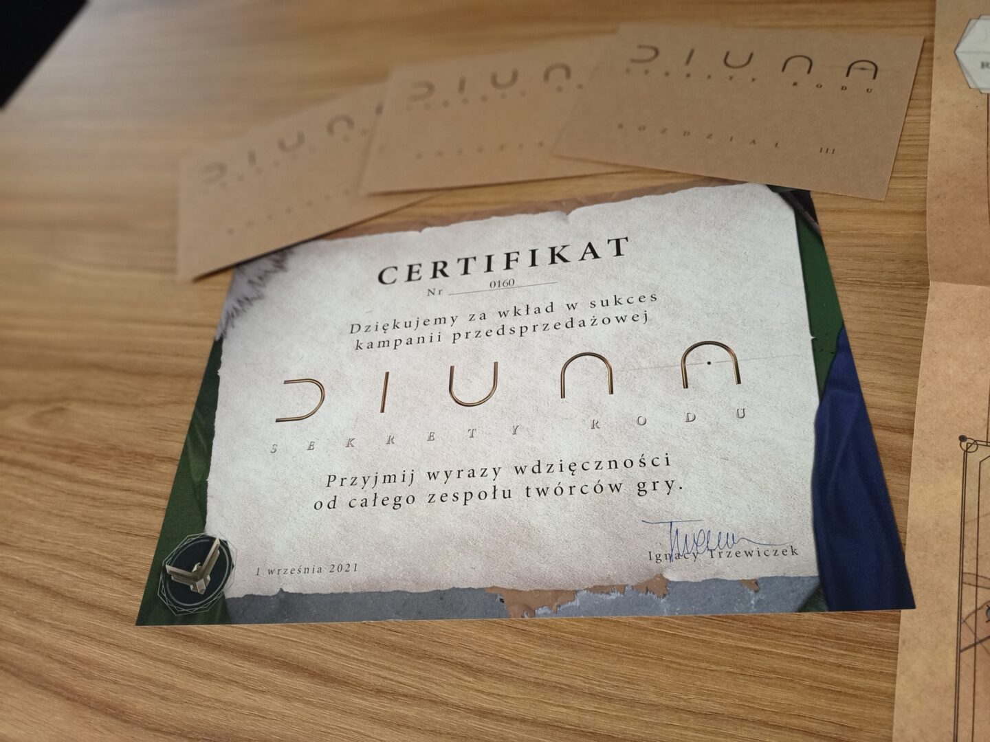 Tradycyjnie już osoby, które wsparły projekt w przedsprzedaży otrzymały atrakcyjne dodatki do swoich egzemplarzy gry. W klimatycznej teczce znaleźć można zakładki dla każdej postaci z dodatkową, bardzo ciekawą historią poprzedzającą wydarzenia w grze. Są tu również świetnie wykonane rysunki, które są jednocześnie pocztówkami. Przygotowano również zaklejone koperty po jednej na prolog i każdy rozdział. Zawierają wskazówki dla bohaterów gry. Na tym jeszcze nie koniec, ponieważ “pierwsi gracze” dostają drewniane żetony konsekwencji wraz z woreczkiem, oraz większych rozmiarów mapę Arrakis. Nie można oczywiście zapomnieć o certyfikacie z podziękowaniami od prezesa Portalu.
