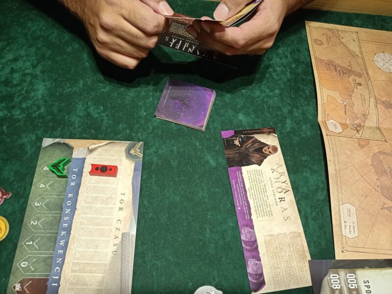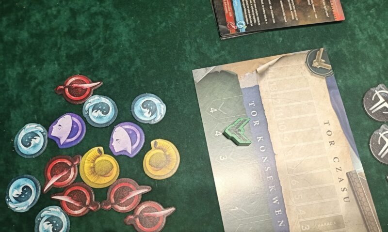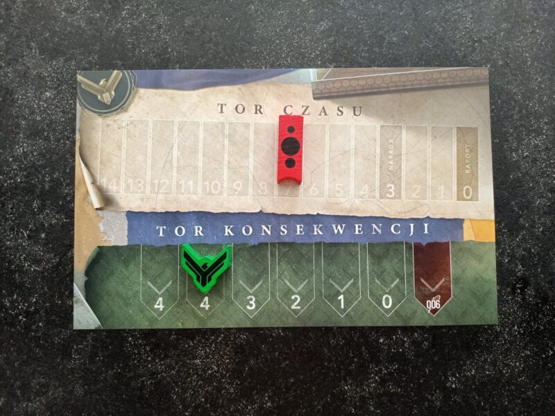No właśnie, o co chodzi z tym ustawianiem misji? W pudełku znajdziemy jeszcze planszę gry, która jest niczym innym jak torem czasu i konsekwencji. Na wielki plus zasługują dwa drewniane znaczniki, które będą pokazywać zmiany na wspomnianych torach. Ignacy Trzewiczek wie, że gracze uwielbiają drewniane komponenty i nie zawahał się ich użyć. Podsumowując wykonanie komponentów jest albo bardzo dobre, albo po prostu odpowiednie do zadań poszczególnych komponentów. Do wydania mam tylko jedną uwagę, którą kieruję w stronę wypraski, do której nie mieści się idealnie opisywana wyżej karta toru czasu. Zabrakło jej paru milimetrów aby się elegancko zmieścić w wyprasce wraz z kartami postaci.