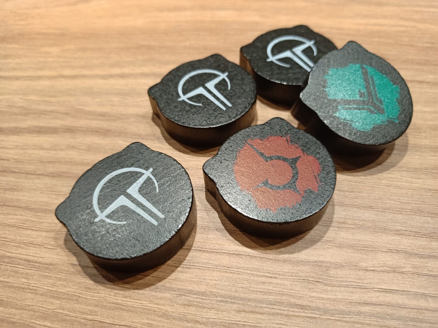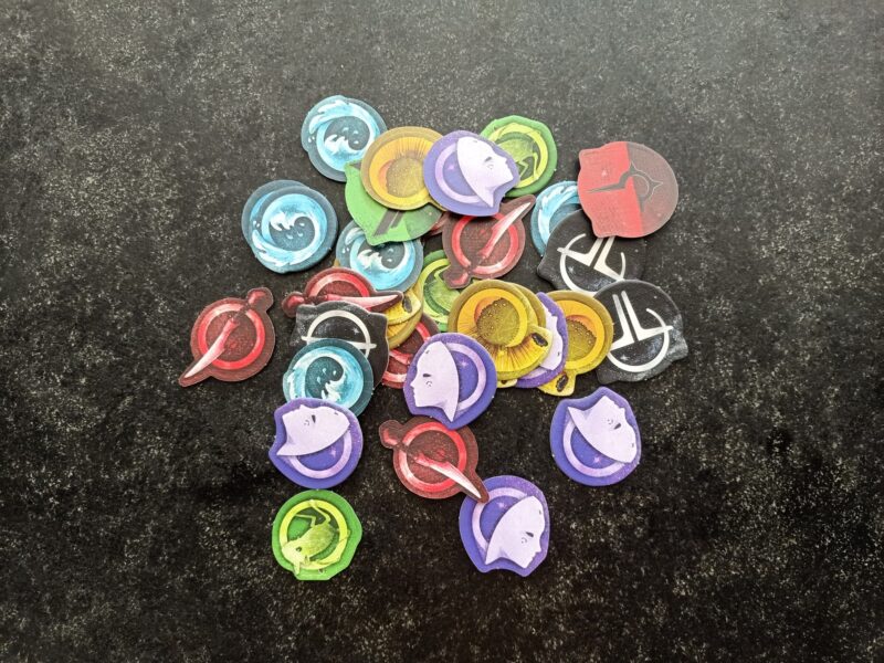 Oprócz kart w nasze posiadanie dostaną się żetony zasobów (27) i konsekwencji (5). Do ich wykonania nie można mieć żadnych zastrzeżeń, gdyż znajdują się na solidnej grubości dużych kartonikach.