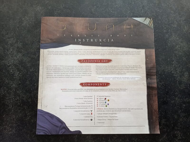 O instrukcjach Portal Games można pisać długo. W pamięci mam jeszcze długie wieczory spędzone na analizowaniu zasad do gry Pierwsi Marsjanie. Do dzisiaj uważam, że to bardzo dobra gra, od której odbiło się wielu graczy właśnie przez instrukcję. Po jej przeczytaniu i tak trzeba było posiłkować się forami i oficjalnymi FAQ. W przypadku Diuny: Sekretów Rodu jest na szczęście zupełnie inaczej. Instrukcja ma tylko osiem stron, a po pierwszych sześciu każe nam się zatrzymać i rozegrać prolog, przed właściwym rozdziałem.