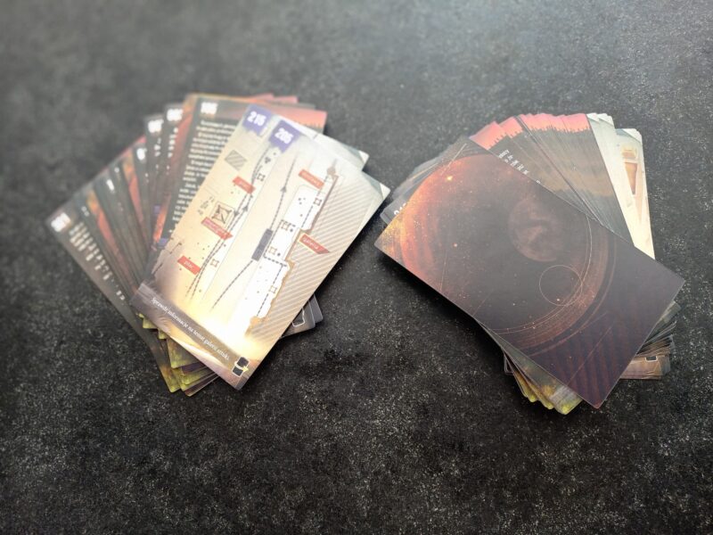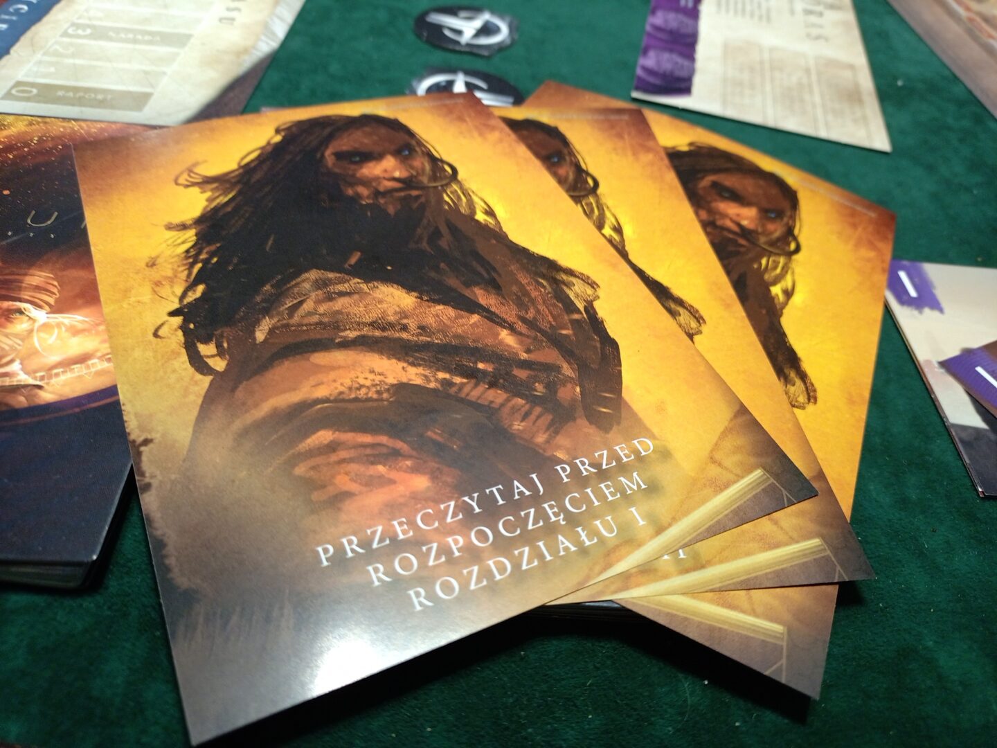 Nie można nie wspomnieć o samych kartach, na których to głównie odkryjemy historię gry Diuna: Sekrety Rodu. Jest ich 72 (wraz z 4 okładkami, które zapobiegają ich “podglądaniu”). Muszę przyznać, że nie są szczególnie grube, a na niektórych z nich zaobserwowałem drobne uszkodzenia. Nie jest to jednak gra w której miałoby to większe znaczenie ponieważ większość czasu są właśnie ukryte, myślę że podjęto właściwą decyzję co do gramatury kart.