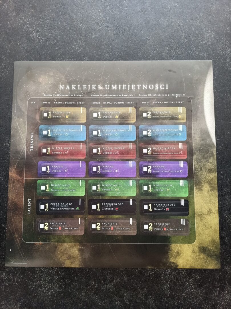 Po pierwsze dostajemy karty postaci. Jak już wcześniej wspomniałem będą to czterej bohaterowie. Na ich kartach, wraz z postępem gry będziemy doklejać kolejne umiejętności, płacąc punktami doświadczenia które zdobędziemy.