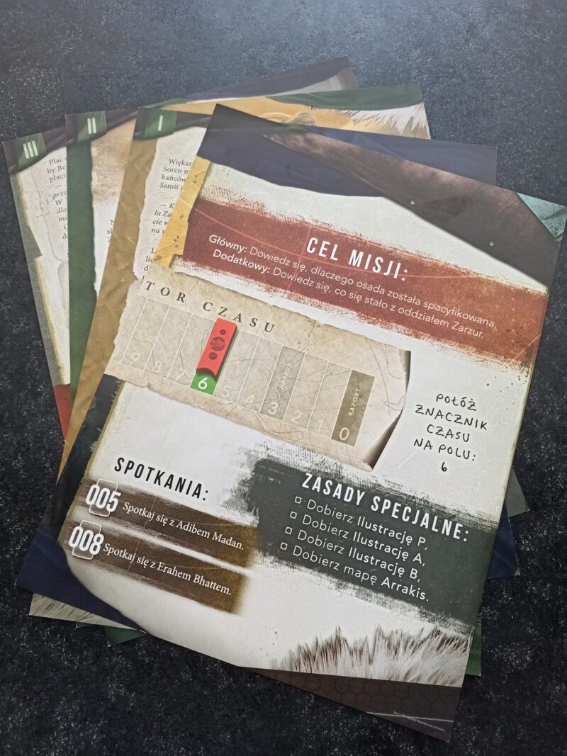 Nie oznacza to, że zasady są wytłumaczone po łebkach i musimy się ich domyślać. Po prostu bardzo uproszczono mechanikę, która sprowadza się do “płacenia czasem” za odsłanianie kart spotkań. Drugą z mechanik śledzonych na torze jest ponoszenie konsekwencji przy bardziej ryzykownych spotkaniach. Przy porażce w losowaniu żetonów konsekwencji, będziemy się zbliżać do pola zerowego na którym ma wydarzyć się coś strasznego. Ma to odzwierciedlać Harkonnenów, którzy wiedzą coraz więcej o naszym rebelianckim oddziale. Dochodzą do tego umiejętności, których możemy się wyuczyć między misjami i zdobywanie dzięki nim zasobów. Na początku gry uznaliśmy tak ustanowione zasady za bardzo dobre posunięcie, gdyż mogą ułatwić skupienie się na samej grze i historii. Jednak zdarzało się nam wracać do instrukcji… ale to z zupełnie innego powodu, który opisałem w akapicie poświęconym samej rozgrywce. Instrukcję gry możecie znaleźć tutaj.