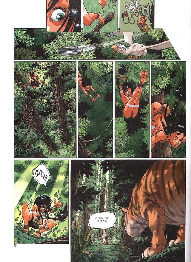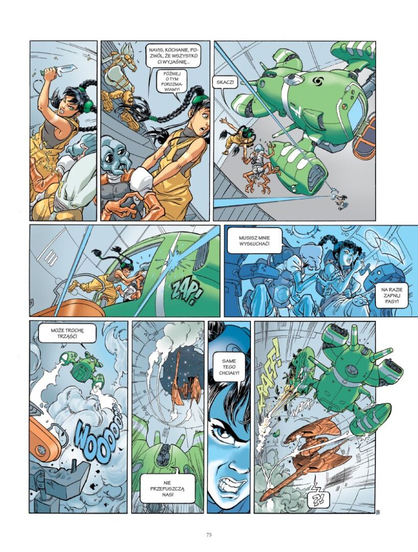 Armadę ilustruje urodzony po belgijskiej części Arden Philippe Buchet. Jak się dowiedziałem, jego ilustracje wpisują się w konwencję komiksu francuskiego i nie chodzi tu o Asteriksa. To co już zapewne zauważyliście, po zamieszczonych w recenzji grafikach to fakt, że bohaterka dosyć często pokazuje swoje kobiece wdzięki. Nie dzieje się tak tylko w pierwszej historii gdzie poznajemy ją żyjącą dziko w głuszy. Tak jak Navis, tak i inne żeńskie kosmitki rysowane są z wieloma kobiecymi szczegółami, aczkolwiek pokazywane są maksymalnie topless. Poza tym kreskę można określić jako dosyć dokładną. Kolory są zwykle żywe i nie tworzą mrocznego klimatu, choć historia niekiedy obiera taki kierunek. Rysunki mogą się podobać i nie mam do nich zastrzeżeń.