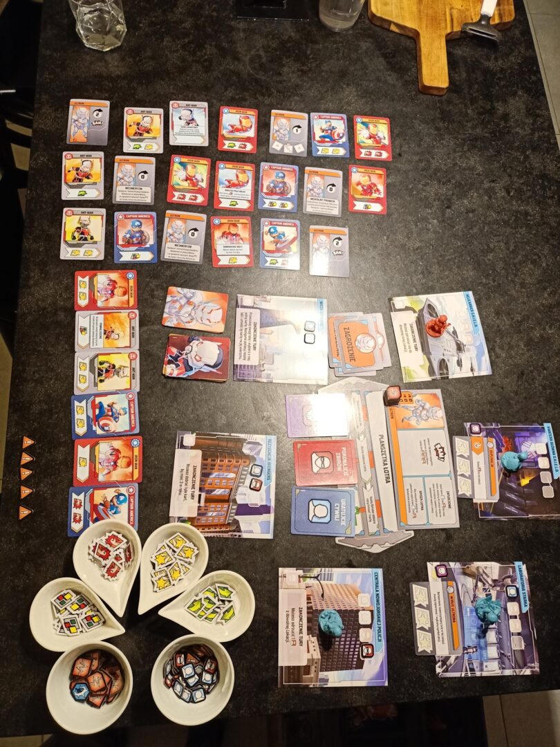 Tradycyjnie już w grach od Portal Games w środku znajdziemy wypraskę, która pomoże nam szybko przygotować i uporządkować grę. Pod przezroczystą, plastikową nakładką na wypraskę znajdziemy bardzo ładnie wyeksponowanych 7 bohaterów i 3 złoczyńców. Kogo znajdziemy w pudełku opiszę przy okazji rozgrywki. Wracając do wspomnianych figurek, to po zdjęciach które znalazłem w internecie, jestem pewien, że da się je kapitalnie pomalować. Co do ich jakości wykonania i spodziewanej trwałości nie mam najmniejszych zastrzeżeń! Podobnie jeśli chodzi o karty bohaterów, łotrów, zagrożeń, zadań i wyzwań. W sumie 144 gładkie karty, które wydają się dosyć solidne. Co ważne, zmieszczą się do wypraski nawet po ich zakoszulkowaniu. Oprócz tego dostajemy nadrukowane na grubszej tekturze, mniej wymiarowe elementy jak 3 planszetki łotrów, 8 lokacji i plan misji. Pomimo tego, że elementy są grubsze niż karty, aż prosiło się aby wydrukować je na grubej tekturze.