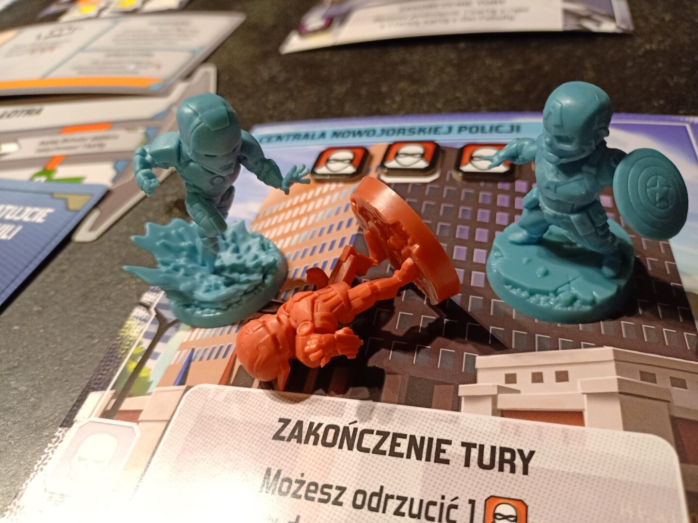 Jak już wiecie, dosyć szybko byłem w stanie wytłumaczyć zasady moim dwóm współgraczom (możecie ich znać z mojej wcześniejszej recenzji gry Diuna: Sekrety Rodu, również od Portalu). Rozstawienie gry, wraz z wyborem postaci zajęło nam około 15 minut, z czego przyjemną częścią tego etapu był wybór super bohatera. Od razu zwróciliśmy uwagę, że przyjęto konwencję nie tłumaczenia ich pseudonimów. W podstawce Marvel United do naszej dyspozycji są: Iron-Man, Captain America, Black Widow, Hulk, Captain Marvel, Ant-Man i Wasp. Co ważne, wybór każdego z nich wiązał się z bardzo klimatyczną rozgrywką. Podam parę przykładów. Hulk potrafił wskoczyć na lokację i załatwić paru zbirów na raz, jednak płoszył cywilów, których przecież musimy ratować. Iron-Man dzielił się swoją technologią rozdając innym dodatkowe żetony. Z kolei niepozorny Ant-Man potrafił się zmniejszyć unikając niebezpieczeństw, by przedostać się do kolejnej lokacji i zadać potężne obrażenia pojedynczemu celowi.