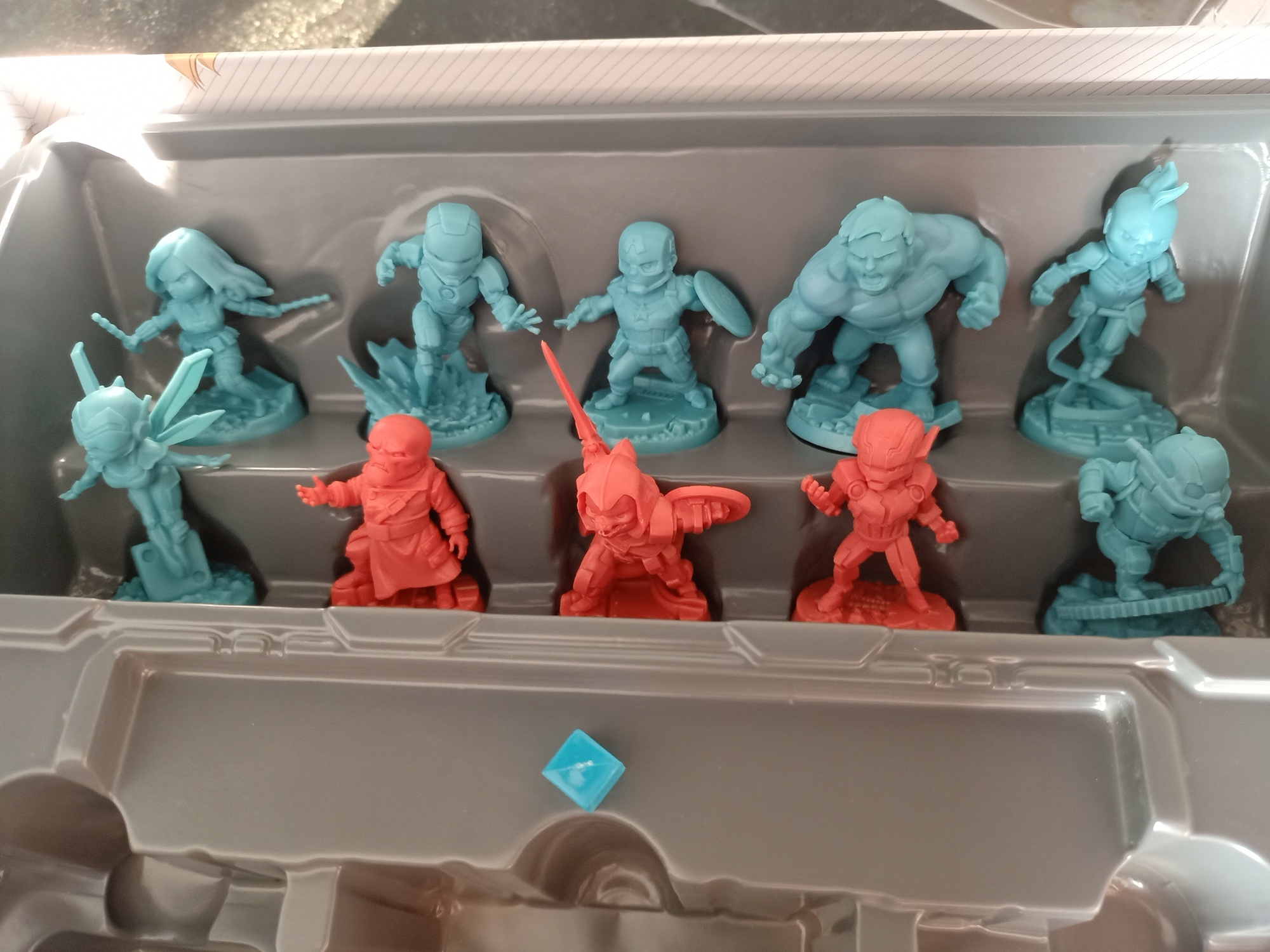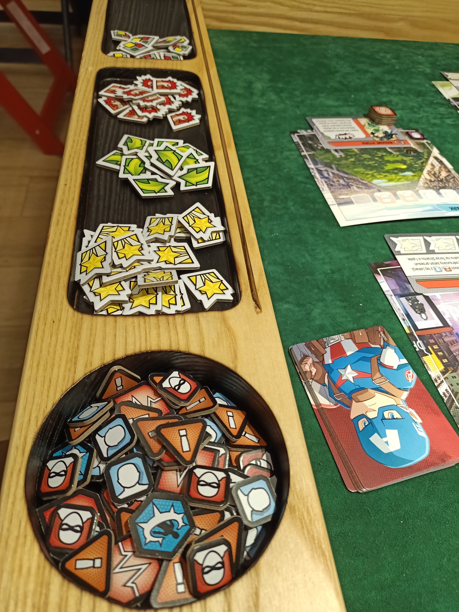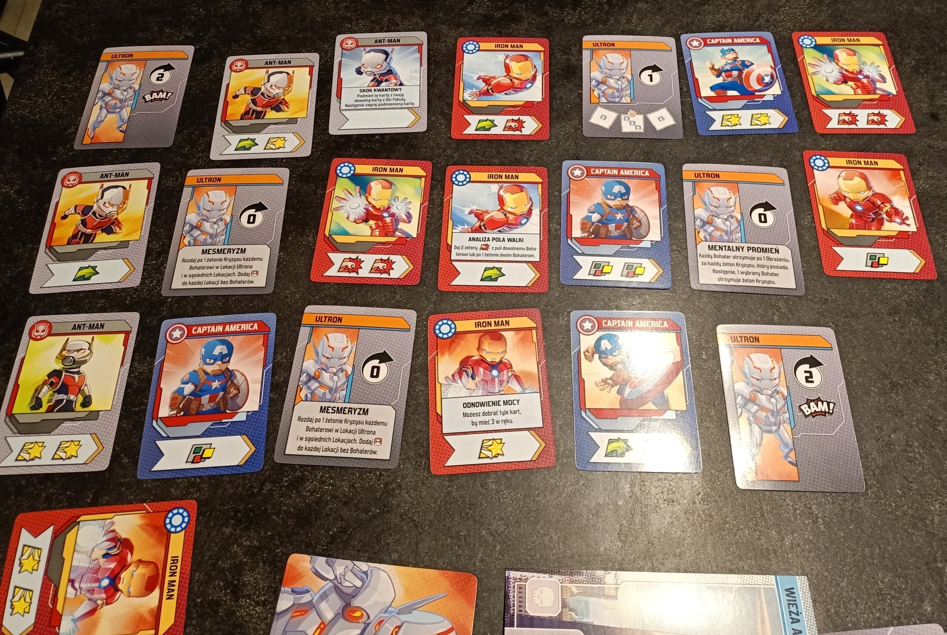 Jak już wiecie, dosyć szybko byłem w stanie wytłumaczyć zasady moim dwóm współgraczom (możecie ich znać z mojej wcześniejszej recenzji gry Diuna: Sekrety Rodu, również od Portalu). Rozstawienie gry, wraz z wyborem postaci zajęło nam około 15 minut, z czego przyjemną częścią tego etapu był wybór super bohatera. Od razu zwróciliśmy uwagę, że przyjęto konwencję nie tłumaczenia ich pseudonimów. W podstawce Marvel United do naszej dyspozycji są: Iron-Man, Captain America, Black Widow, Hulk, Captain Marvel, Ant-Man i Wasp. Co ważne, wybór każdego z nich wiązał się z bardzo klimatyczną rozgrywką. Podam parę przykładów. Hulk potrafił wskoczyć na lokację i załatwić paru zbirów na raz, jednak płoszył cywilów, których przecież musimy ratować. Iron-Man dzielił się swoją technologią rozdając innym dodatkowe żetony. Z kolei niepozorny Ant-Man potrafił się zmniejszyć unikając niebezpieczeństw, by przedostać się do kolejnej lokacji i zadać potężne obrażenia pojedynczemu celowi.