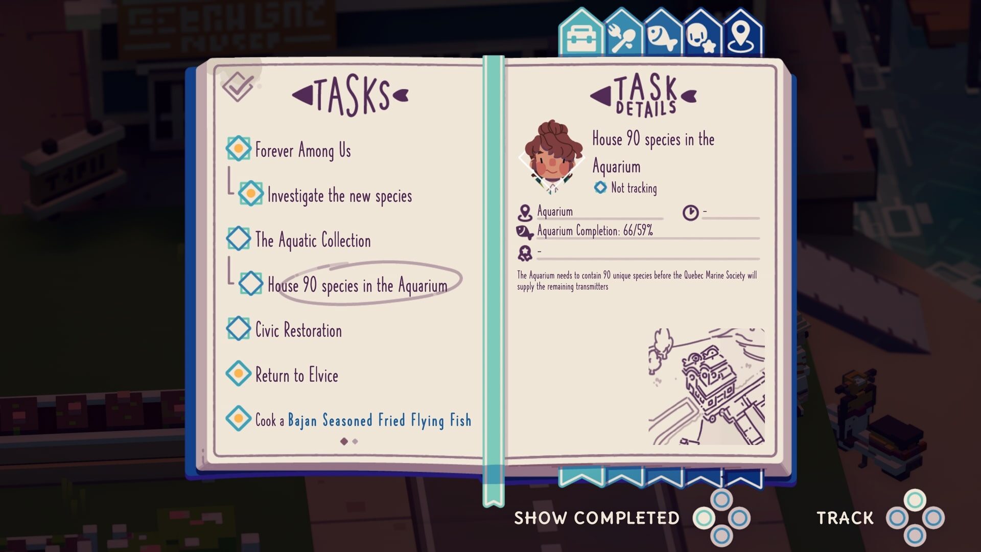 Ekwipunek, podgląd zadań, odkryte przepisy czy stworzonka znajdziemy w menu. Przepisy i ryby oraz owoce morza będą aktualizowane wraz z tym, jak będziemy je odkrywać. Fajnym zabiegiem jest uzupełnianie ich nawet częściowo, czasem z błędnymi nazwami, które weryfikujemy po złapaniu okazu.
