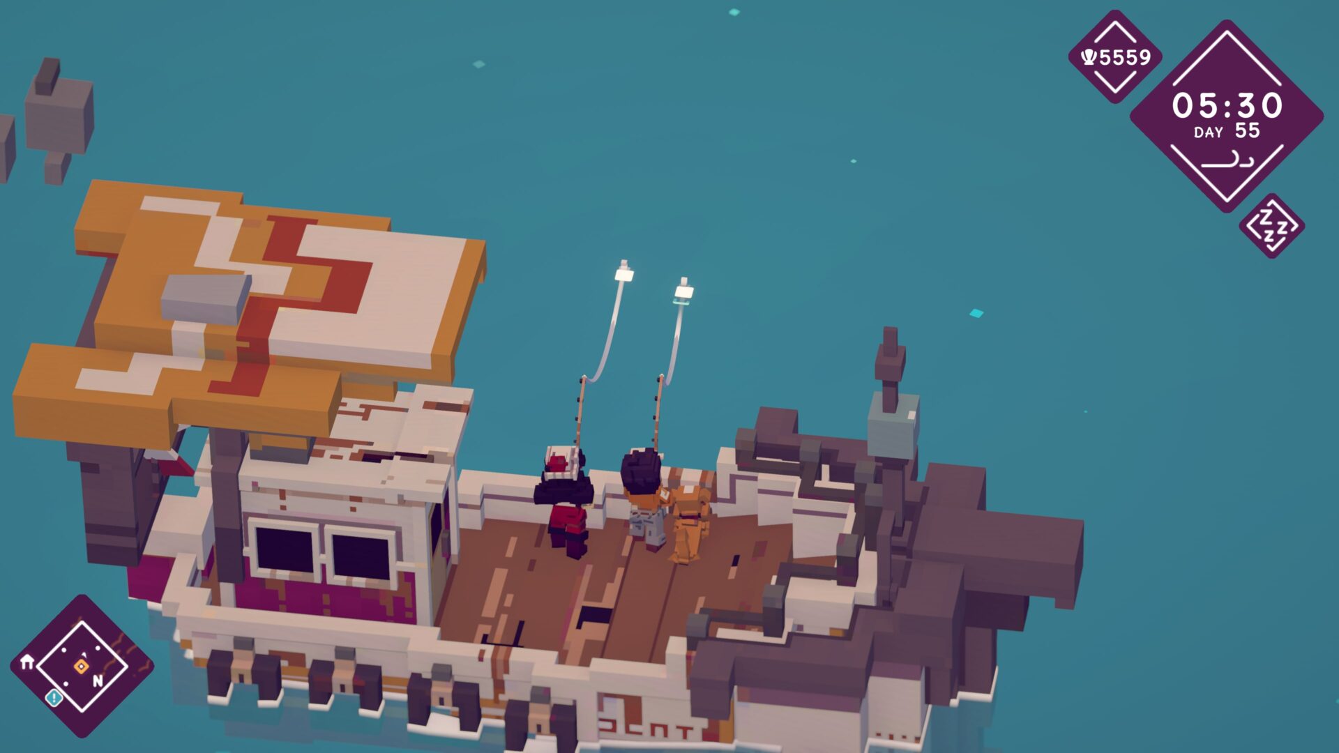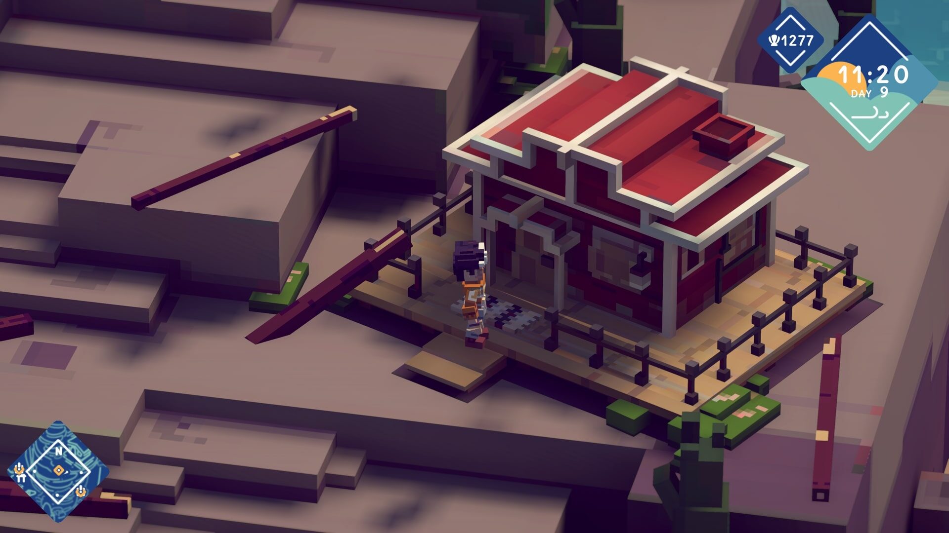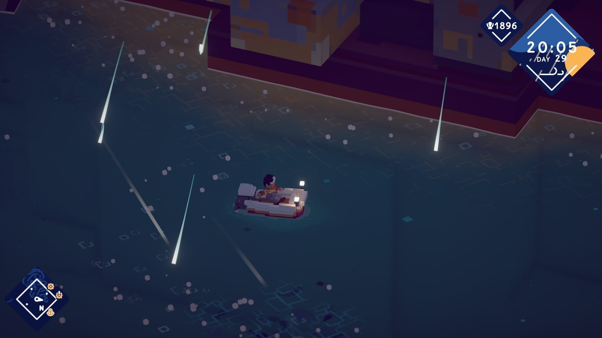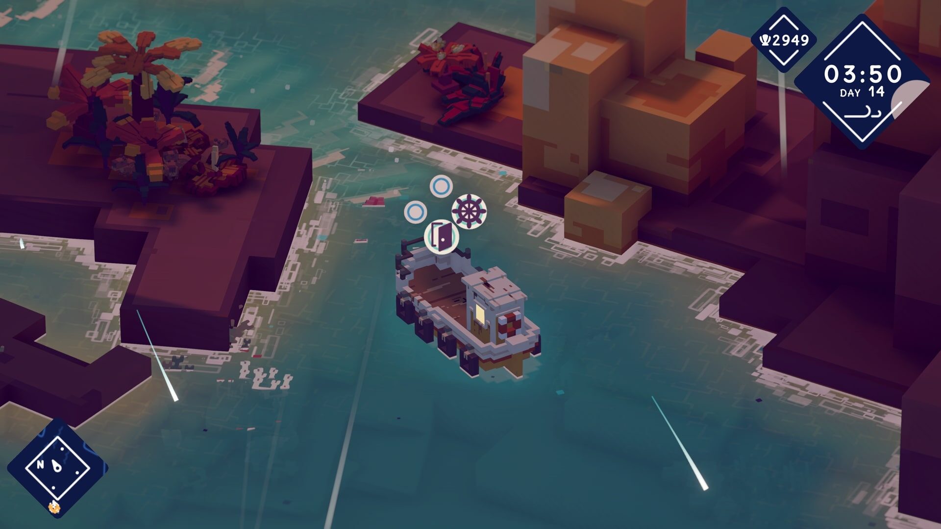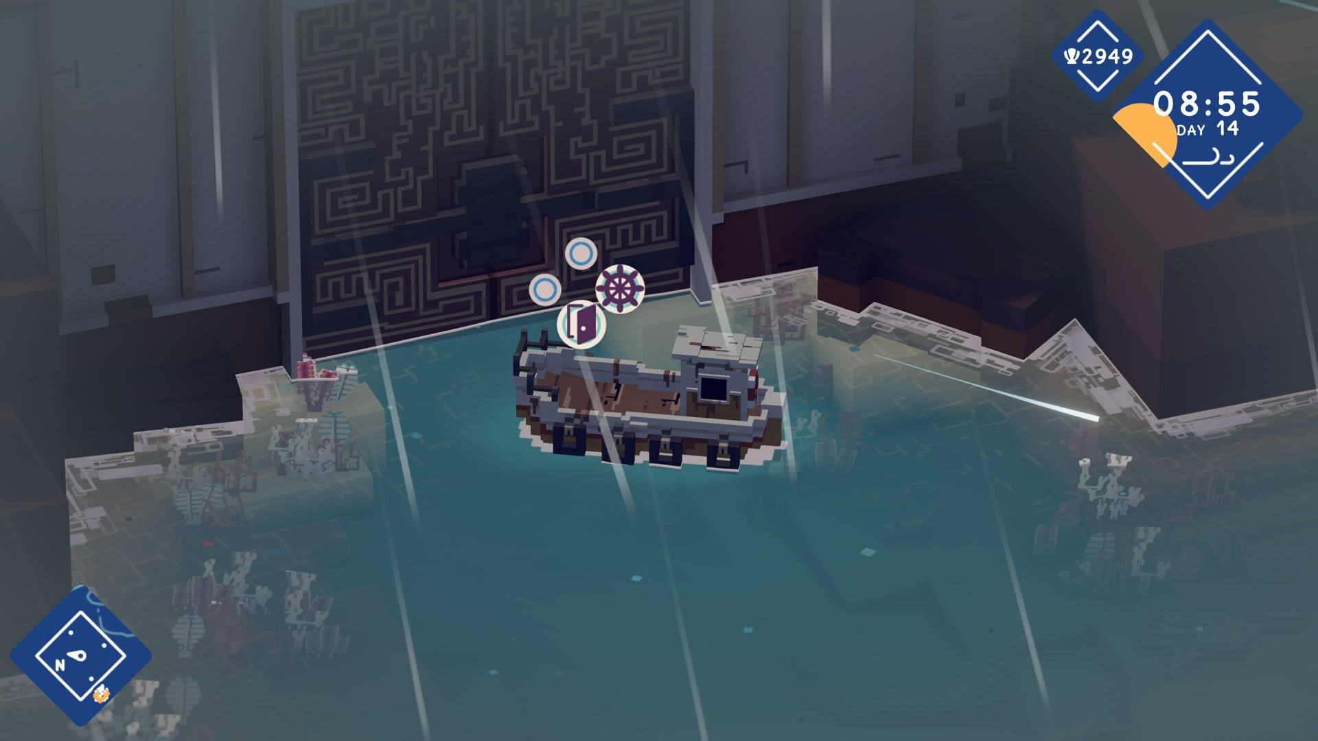 Pomijając problemy z widocznością kolorów akcentowych na ikonkach, szczególnie, gdy ktoś ma wadę wzroku, całość interfejsu jest niesamowicie urocza. Z lewej na dole mamy kompas, na którym widzimy też zarysy miejsc czy budynków z mapy, a w prawym górnym rogu informację o posiadanych pieniądzach (naszą walutą są muszle) oraz kafelek z godziną i dniem. I ten ostatni, największy, kafelek, będzie się non stop zmieniał! Zobaczymy na nim pogodę i pory dnia. Kolory wszystkich pozostałych ikonek będą zmieniać się zgodnie z właśnie porą dnia czy pogodą, zazwyczaj oscylując między fioletowym i niebieskim. Przepiękne.