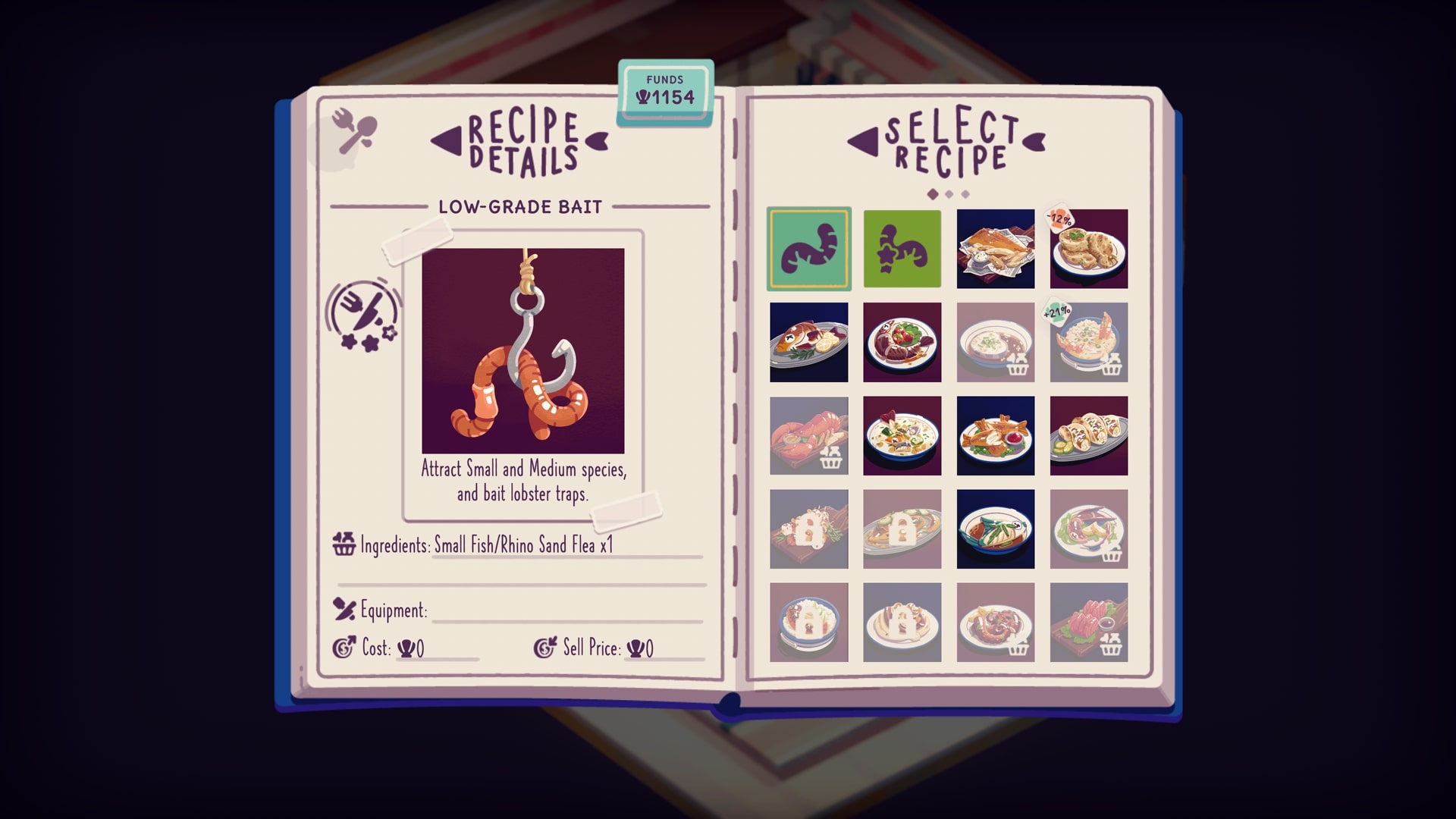 Ekwipunek, podgląd zadań, odkryte przepisy czy stworzonka znajdziemy w menu. Przepisy i ryby oraz owoce morza będą aktualizowane wraz z tym, jak będziemy je odkrywać. Fajnym zabiegiem jest uzupełnianie ich nawet częściowo, czasem z błędnymi nazwami, które weryfikujemy po złapaniu okazu.