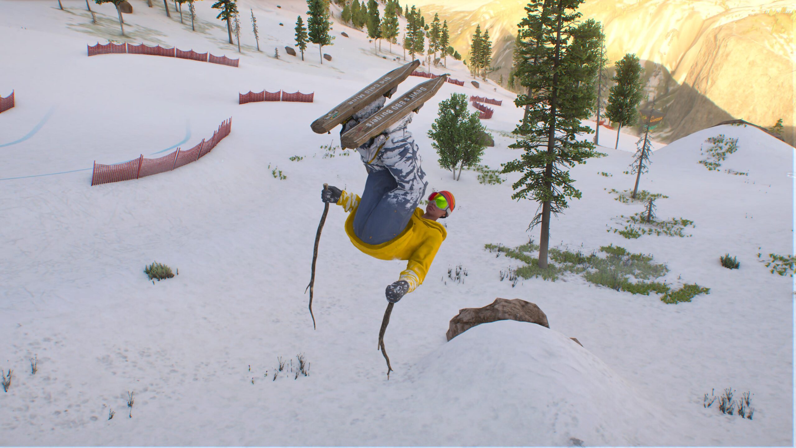 Wspomniałem, że miejsce, po którym podróżujemy powstało na bazie kilku amerykańskich parków narodowych. Są to m.in.: Bryce Canyon, Yosemite Valley, Sekwoi, Zion, Canyonlands, Mammoth Mountain czy Grand Teton. Wszystkie zostały połączone w jedno wyjątkowe miejsce, w którym znajdziemy śnieżne szczyty, kaniony oraz zielone doliny. W Riders Republic nie zabrakło także zawodów, które łączą dostępne w grze dyscypliny. Możemy zacząć zmagania na szczycie góry na nartach, następnie po uporaniu się ze śniegiem przeskakujemy na rower, a wyścig kończymy w kombinezonie latającej wiewiórki. Podobny patent zastosowano już w innej produkcji Ubisoftu – The Crew 2. Tam gracze w trakcie zawodów przeskakiwali z samochodów do motorówek, a z nich do samolotów.