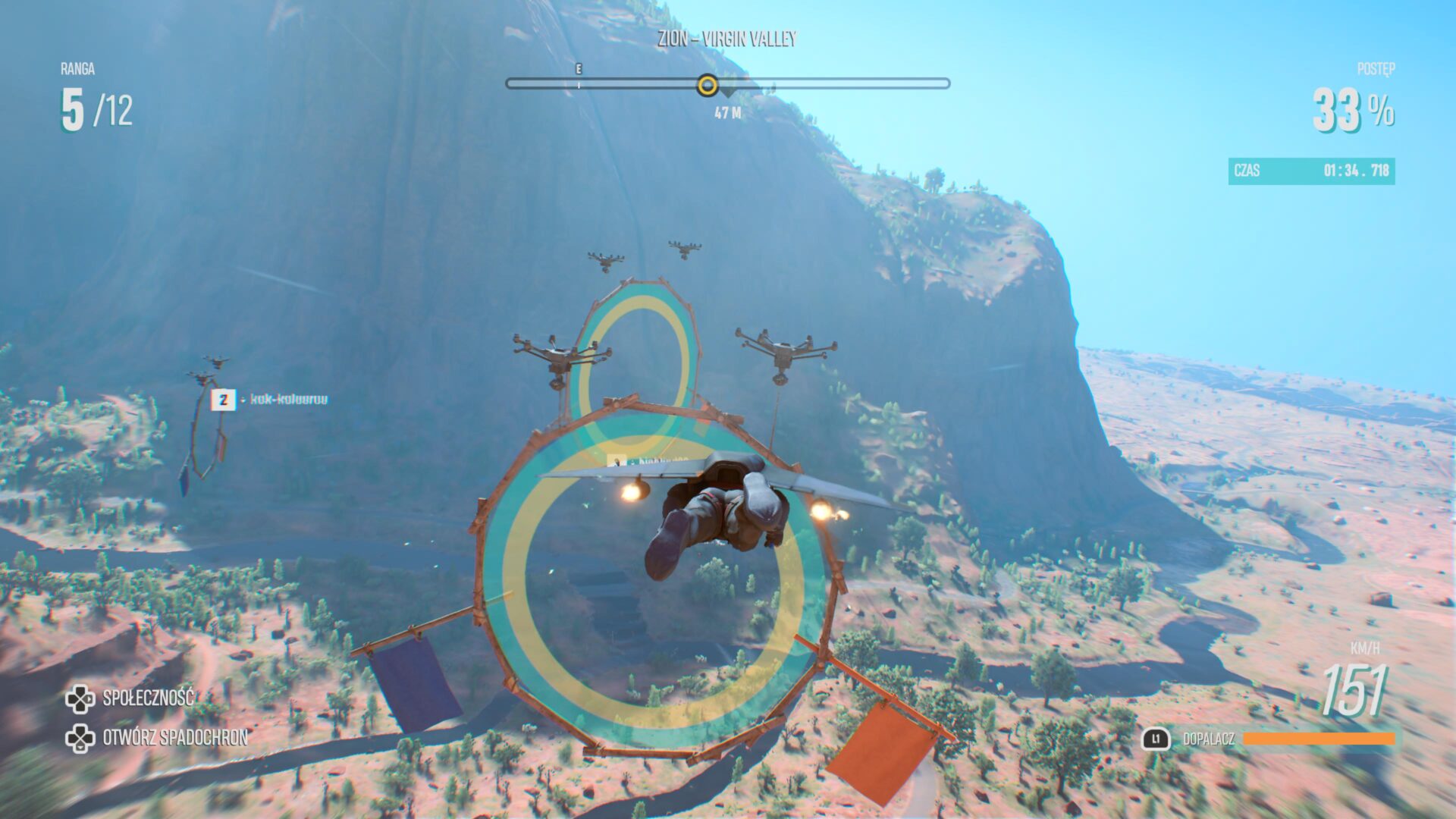 Riders Republic opiera się dokładnie na tych samych schematach, co Steep. Gracz tworzy swojego zawodnika, a następnie rusza w głąb ogromnego świata, rywalizując w wielu ekstremalnych dyscyplinach. Wśród dyscyplin znalazły się m.in. wyścigi (zjazdy) i triki na rowerach, wyścigi i popisy umiejętności na nartach lub snowboardzie oraz wingsuiting. Ten ostatni to ekstremalne loty w specjalnych kombinezonach lub skrzydłach z silnikami odrzutowymi. Latanie to zdecydowanie najtrudniejsza z dyscyplin. Tym bardziej, że przy dużej prędkości musimy trafić w okrąg, który jest punktem kontrolnym. Te często są przyklejony do ścian kanionów i łatwo się rozbić.