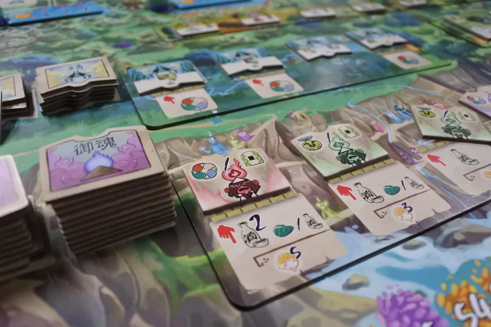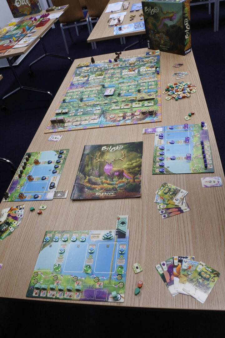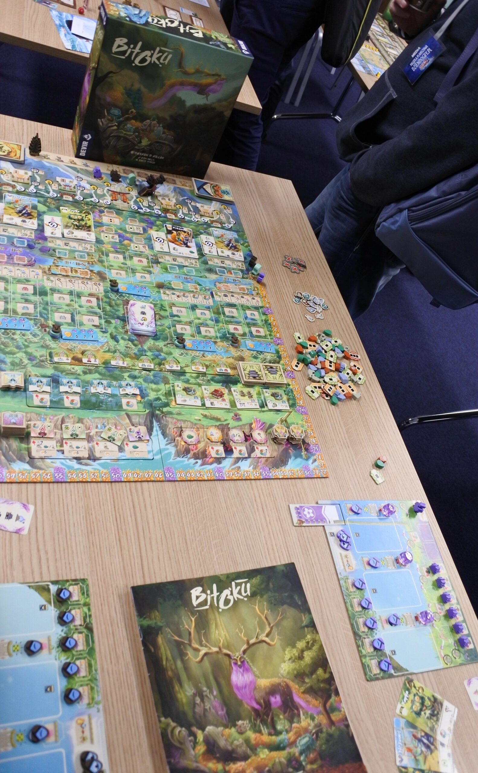 Pierwsze co nasuwa się po spojrzeniu na grafiki Bitoku to skojarzenia z animacjami Studia Ghilbli. W grze wcielimy się w leśne duchy walczące o przychylność pradawnych bóstw. Znowu zmierzy się w niej od jednego do czterech graczy. Osobiście Bitoku wydało mi się dosyć mało czytelna na pierwszy rzut oka, właśnie przez to atrakcyjne, niezwykle kolorowe wykonanie. Wiadomo jednak, że warto byłoby wpierw ograć tę produkcję, aby stwierdzić czy faktycznie tak jest. W końcu jej średnia ocen na BGG to 8.0.