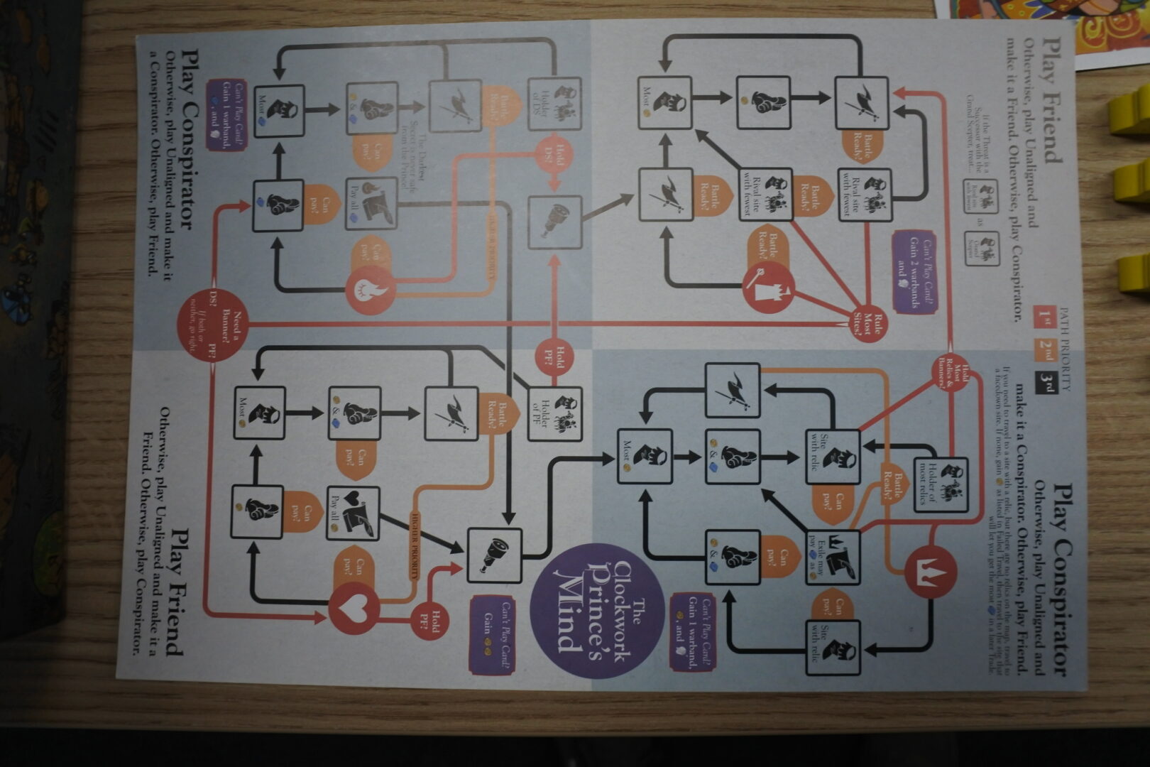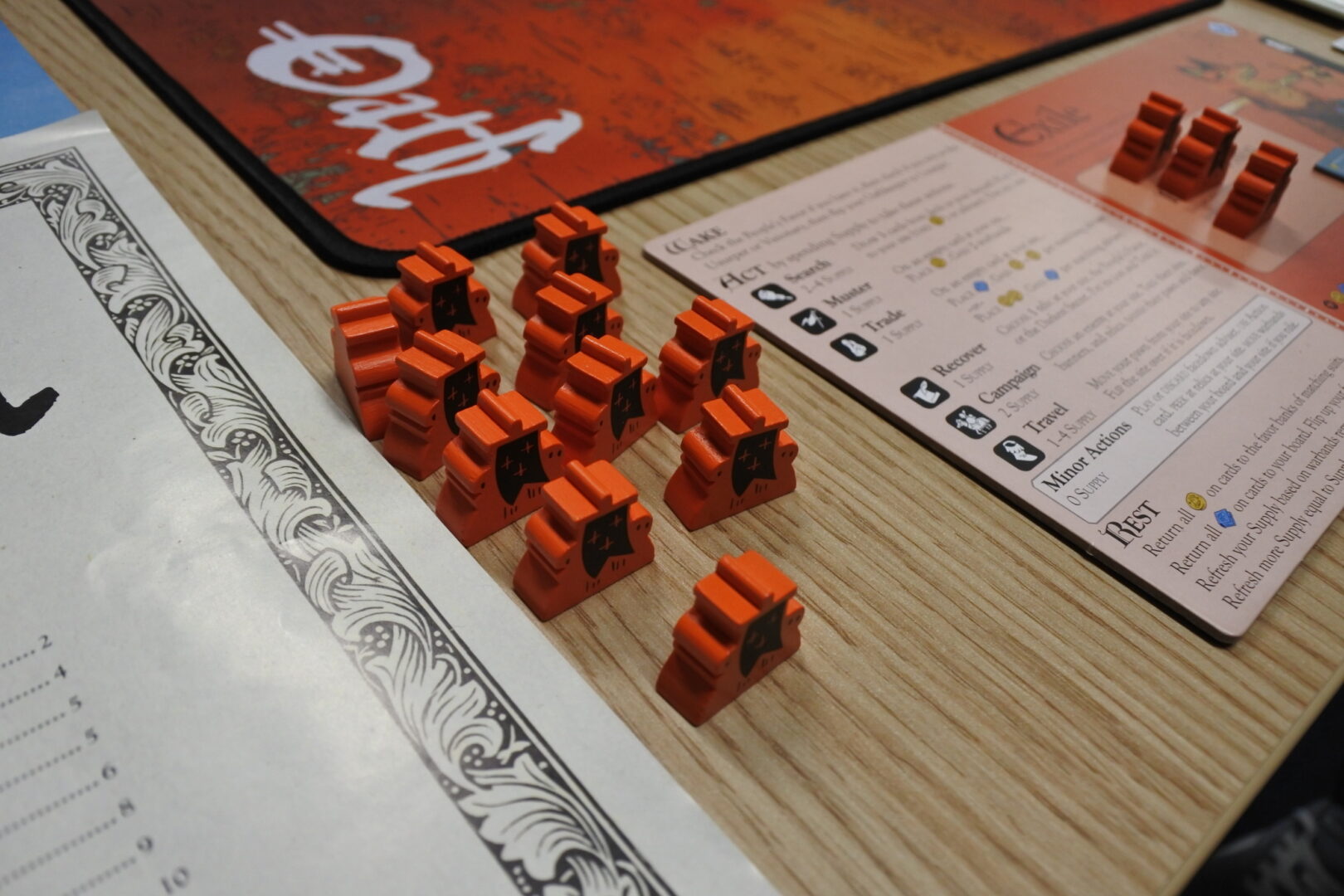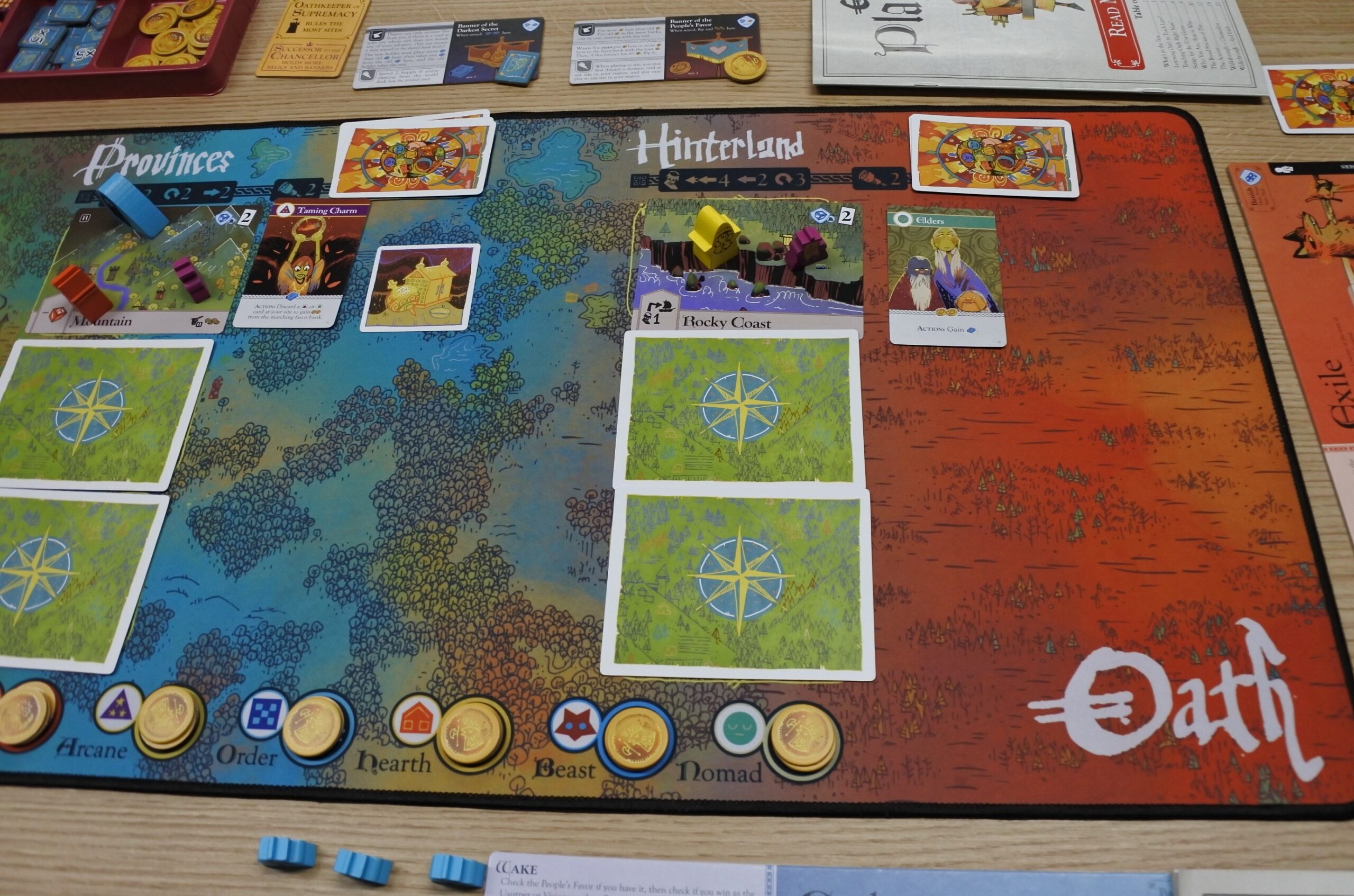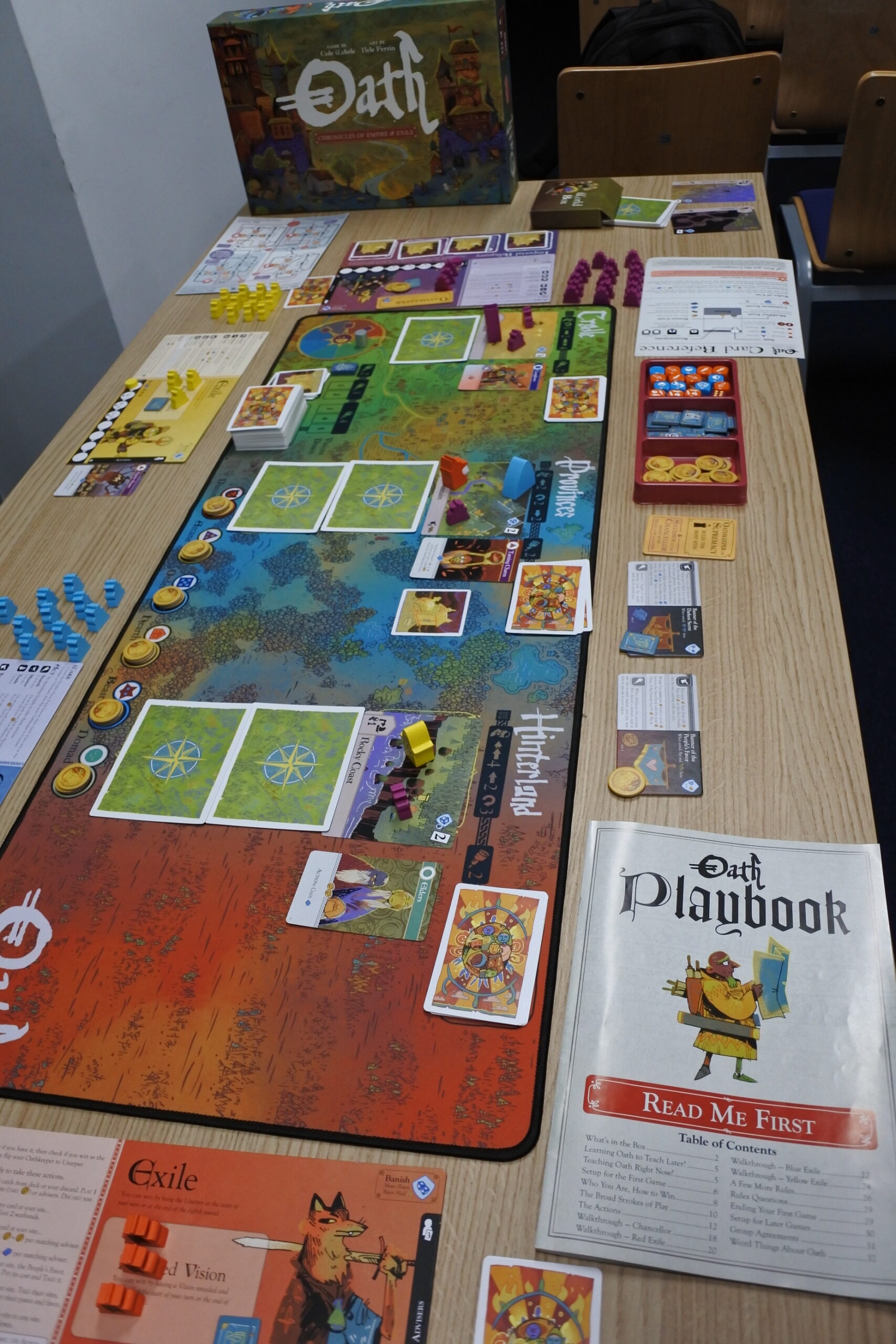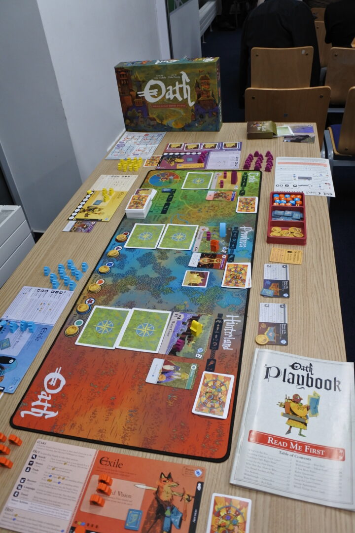 Trzecim tytułem, który z medialnej prezentacji trafił na moją listę wyczekiwanych gier jest z pewnością Oath: Kroniki Władzy i Banicji. Występuje tutaj asymetria między jednym graczem (kanclerzem) a resztą pretendentów do tytułu. W grze może zagrać od jednego (drzewko gry solo znajdziecie na jednym ze zdjęć) do 6 graczy. Jest to tytuł strategiczny, z elementami gry narracyjnej i motywem legacy. Tak! Jeżeli gracze postanowią w określony sposób osłabić królestwo, aby w ten sposób obalić kanclerza, skutki tych działań możemy zobaczyć w kolejnych rozgrywkach!