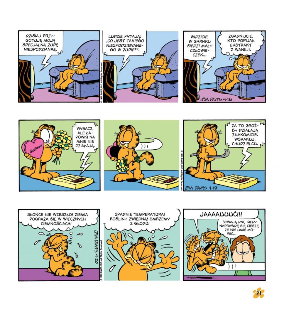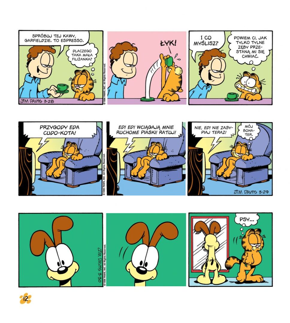 Garfield niezmiennie od kilkudziesięciu lat przekonuje do siebie czytelników na całym świecie prostotą swojego podejścia. Próżno tu więc szukać jakichś głębszych rozważań nad sensem życia, czy poważnych rozterek moralnych. Nie znaczy to bynajmniej, że nasz puchaty rudzielec nie miewa przebłysków, które mogłyby go zachęcić do bardziej aktywnego stylu życia. Znikają one jednak tak szybko jak porcja lazanii, ulubionego przysmaku tytułowego kota. W recenzowanym wydaniu znajdziemy skondensowaną dawkę humoru wyśmiewającą wiele sytuacji z życia codziennego. Będziemy się więc mogli zaśmiać z noworocznych postanowień, zobaczymy jak kawa działa na osoby ją spożywającą czy dowiemy się, jakie są największe różnice między psami, a kotami – oczywiście na przykładzie Odiego. Zobaczymy również, jakie jest stanowisko Garfielda do Halloween, randek czy ogólnie jakiejkolwiek aktywności fizycznej. Opowiastki z nieco za grubym kotem ani trochę się nie zestarzały, dzięki czemu bawią teraz równie dobrze jak przed laty. Nie znajdziemy tu morałów, ale jeśli szukacie okazji do beztroskiej lektury i szczerego uśmiechu, to Garfield zdecydowanie powinien trafić do Waszej biblioteki.