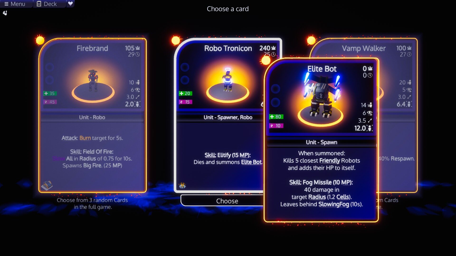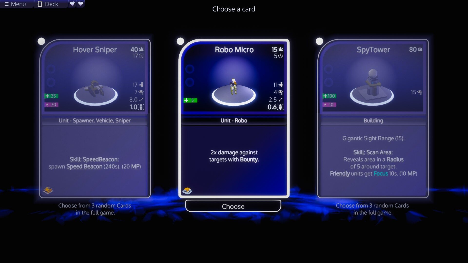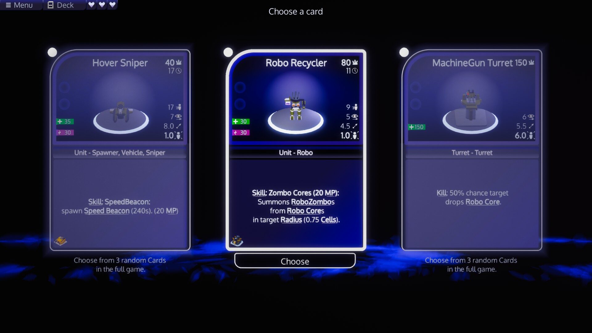 Wspomniałem, że przy odpaleniu Rogue Command wróciły wspomnienia. Deweloperzy Feneq nie osiadają jednak na laurach i dodają elementy roguelike i deck-buildingu do całej mikstury. Jednym ze smaczków jest to, że będziemy się bić na proceduralnie generowanych polach bitew. Kolejnym jest system kart, które dobierzemy pomiędzy rozgrywkami. W wersji demonstracyjnej nie można było wybrać kart produkcyjnych poza tymi wskazanymi przez twórców, ale można było już zaszaleć, jeśli chodzi o upgrady i hacki. Są to dodatki, które możemy dołączyć do już wybranych kart głównych. Na przykład wybrana jednostka będzie miała szanse na wskrzeszenie dwóch wybuchających robotów przy śmierci albo dodatkowe działka pojawiające się przy budowanej strukturze. To właśnie te decyzje, widoczne później na polu bitwy, dawały najwięcej satysfakcji.