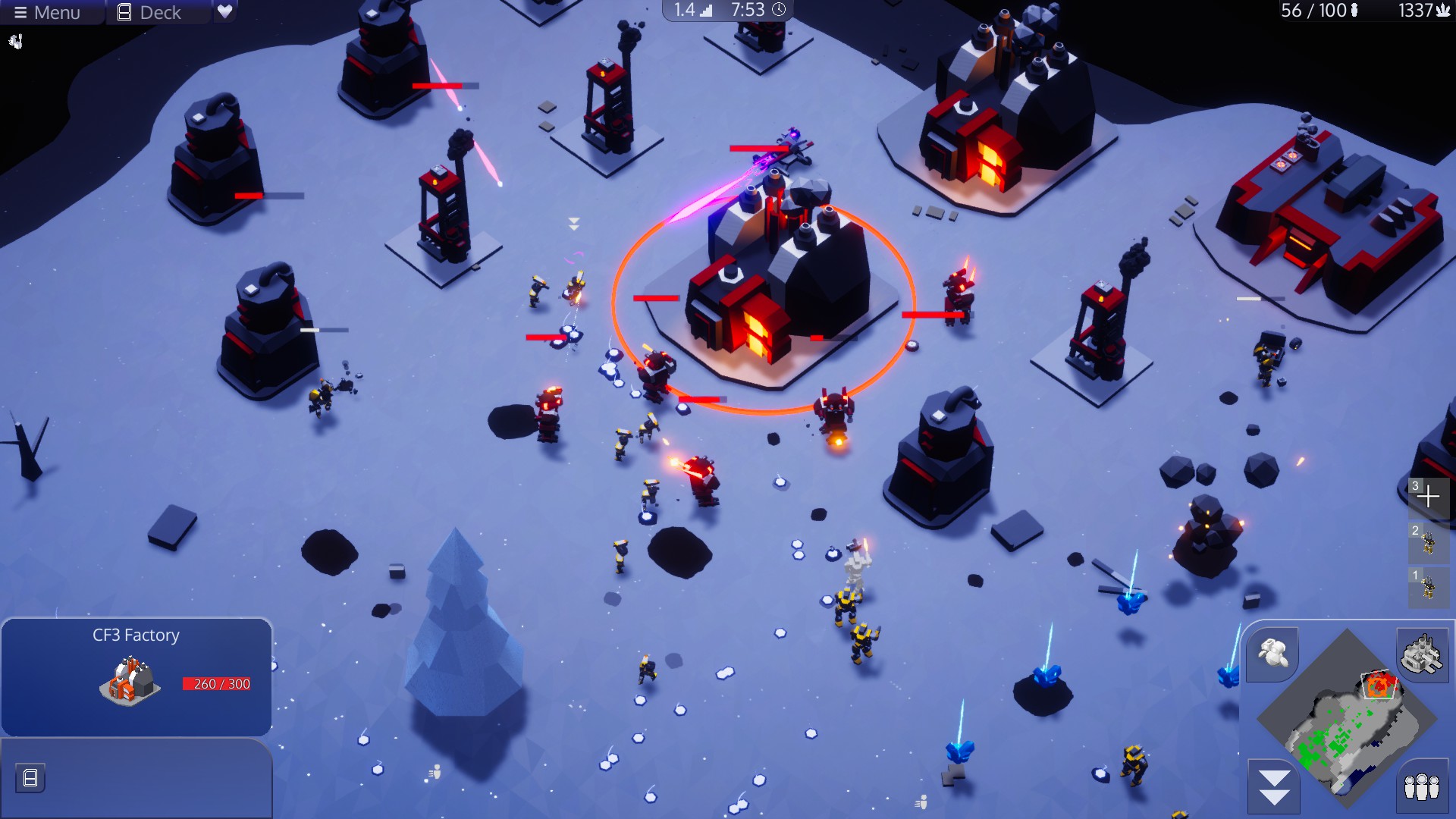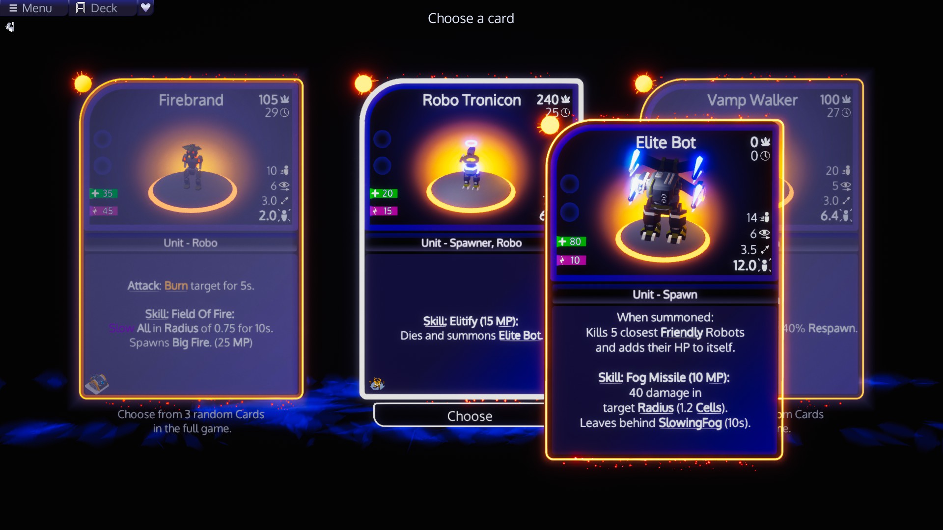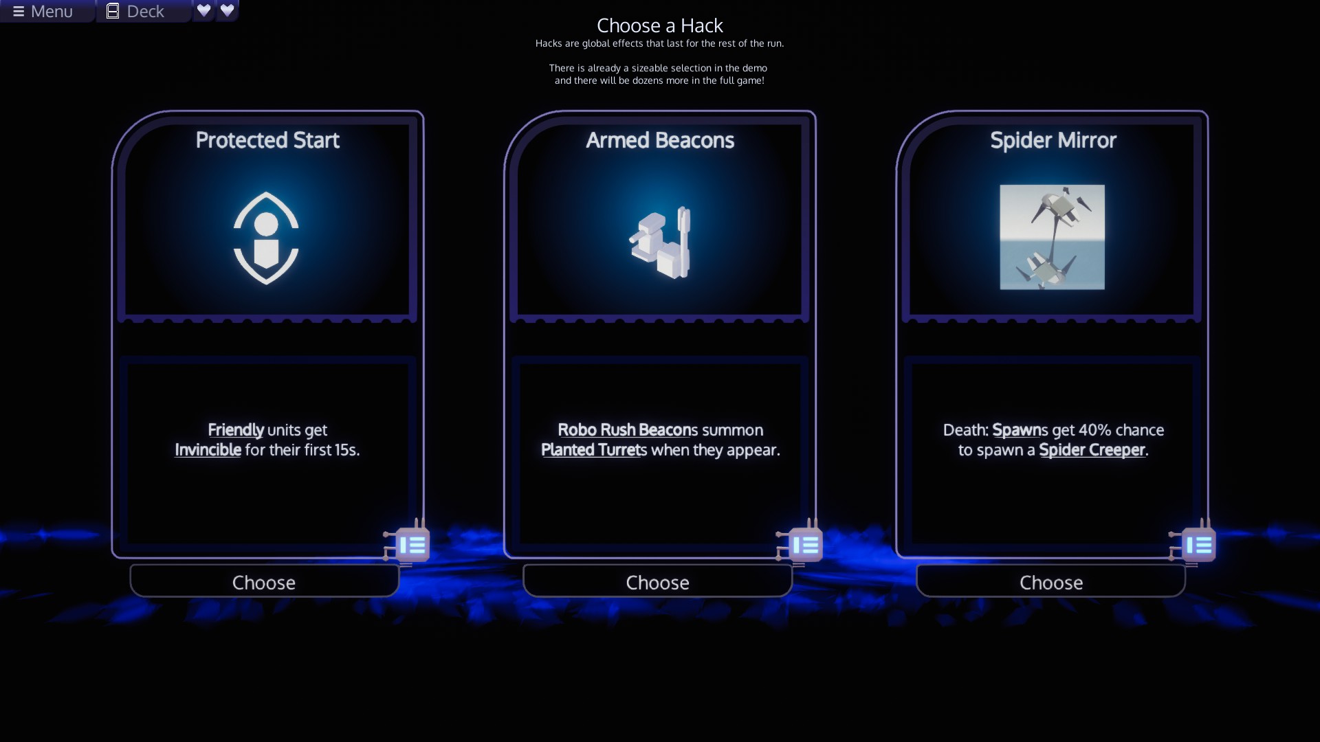 Wspomniałem, że przy odpaleniu Rogue Command wróciły wspomnienia. Deweloperzy Feneq nie osiadają jednak na laurach i dodają elementy roguelike i deck-buildingu do całej mikstury. Jednym ze smaczków jest to, że będziemy się bić na proceduralnie generowanych polach bitew. Kolejnym jest system kart, które dobierzemy pomiędzy rozgrywkami. W wersji demonstracyjnej nie można było wybrać kart produkcyjnych poza tymi wskazanymi przez twórców, ale można było już zaszaleć, jeśli chodzi o upgrady i hacki. Są to dodatki, które możemy dołączyć do już wybranych kart głównych. Na przykład wybrana jednostka będzie miała szanse na wskrzeszenie dwóch wybuchających robotów przy śmierci albo dodatkowe działka pojawiające się przy budowanej strukturze. To właśnie te decyzje, widoczne później na polu bitwy, dawały najwięcej satysfakcji.