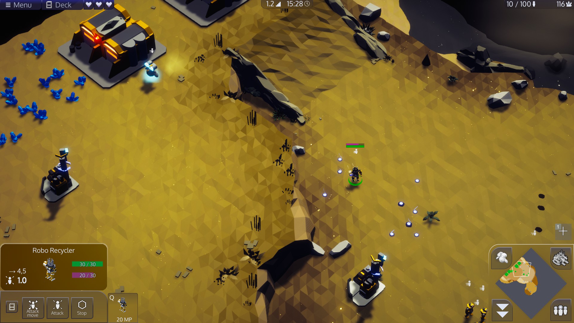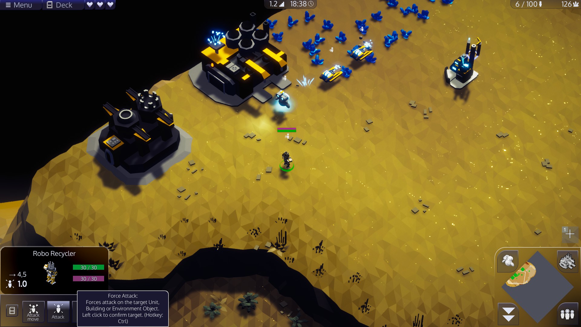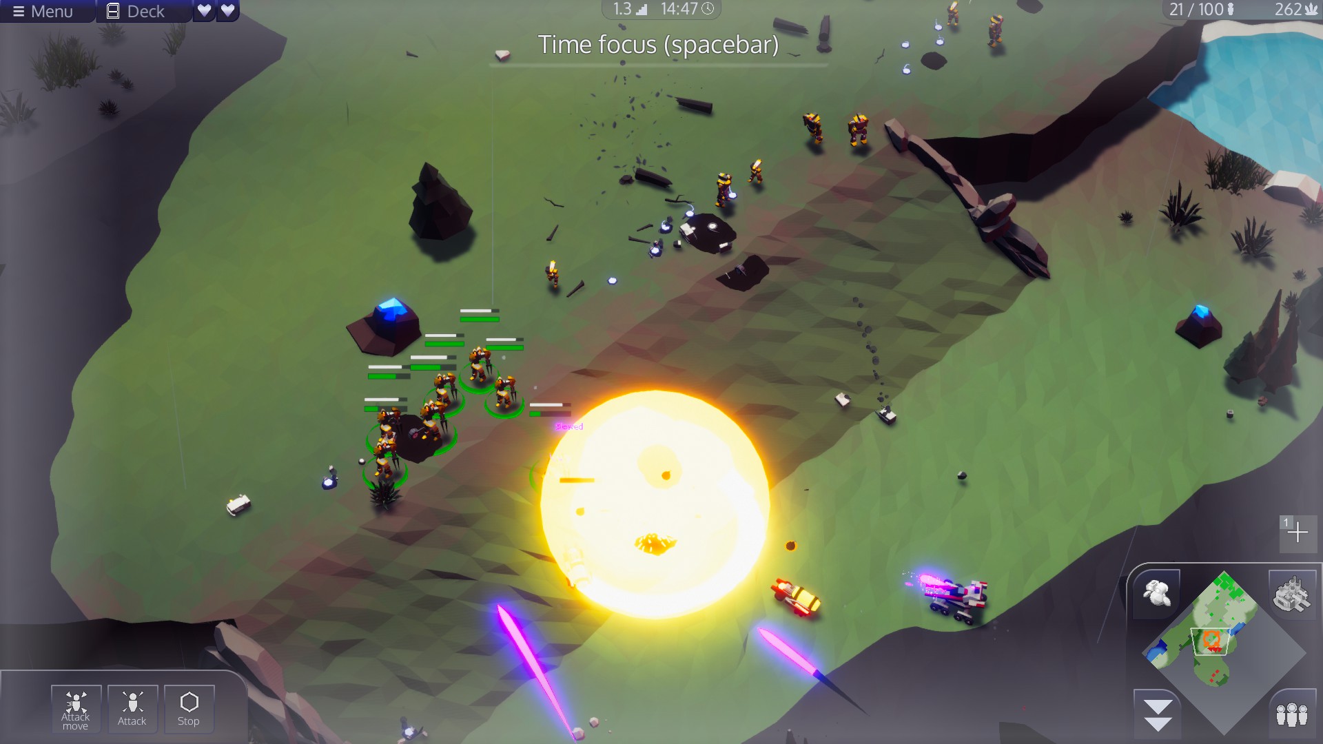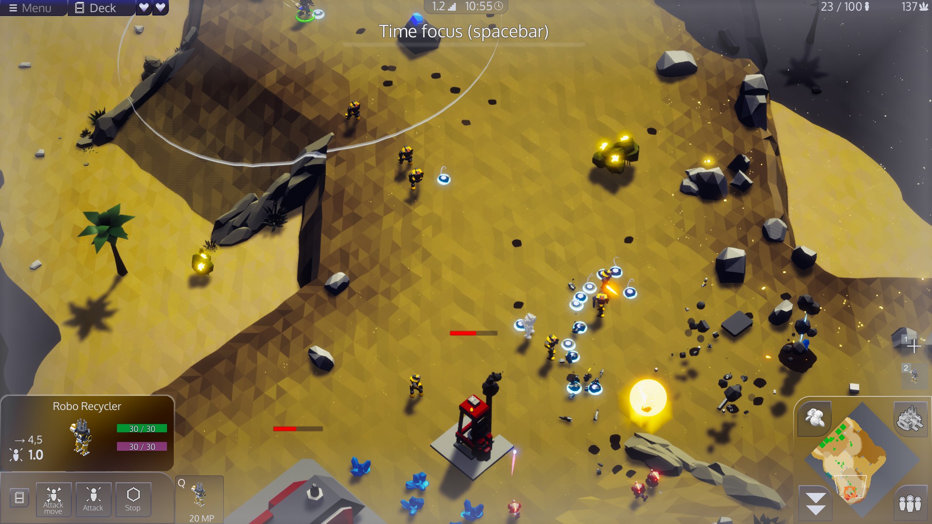 Budujemy fabryki, one produkują jednostki, które wreszcie wysyłamy do walki, gdzie mogą wykorzystać swoje specjalne umiejętności. Może to być wystrzelenie rakiety osłabiającej wrogów czy wskrzeszenie poległych robotów jako zombie. Trudno byłoby to zrobić efektywnie bez spowolnienia czasu (do 10% szybkości). Łapałem się na tym, że większość rozgrywki właściwie spędzałem w tym trybie. Stąd wniosek, że obsługa gry na padzie w normalnej prędkości byłaby bardzo mało efektywna. Ciekaw jestem, czy zmianie ulegnie bazowa prędkość rozgrywki.
