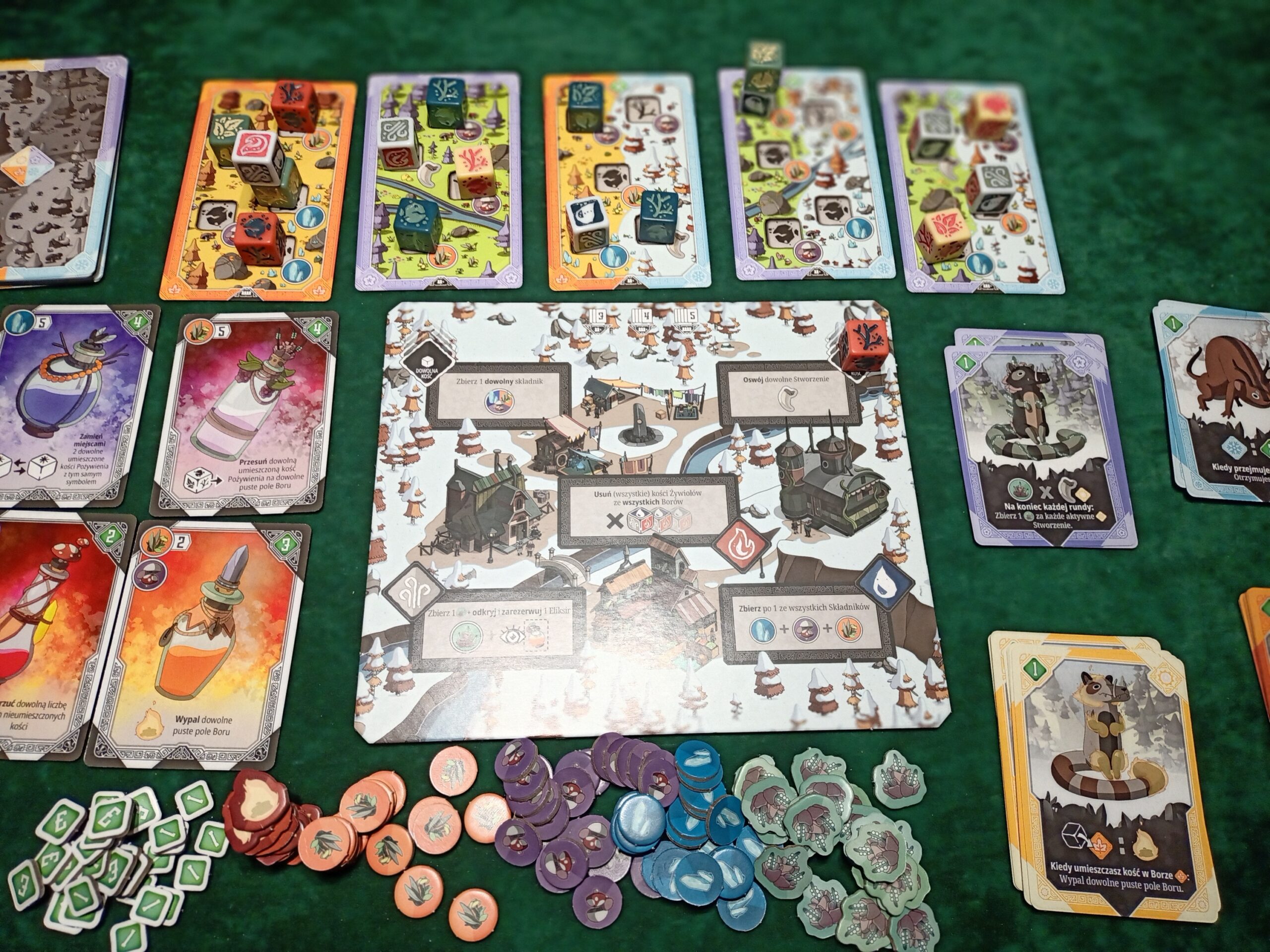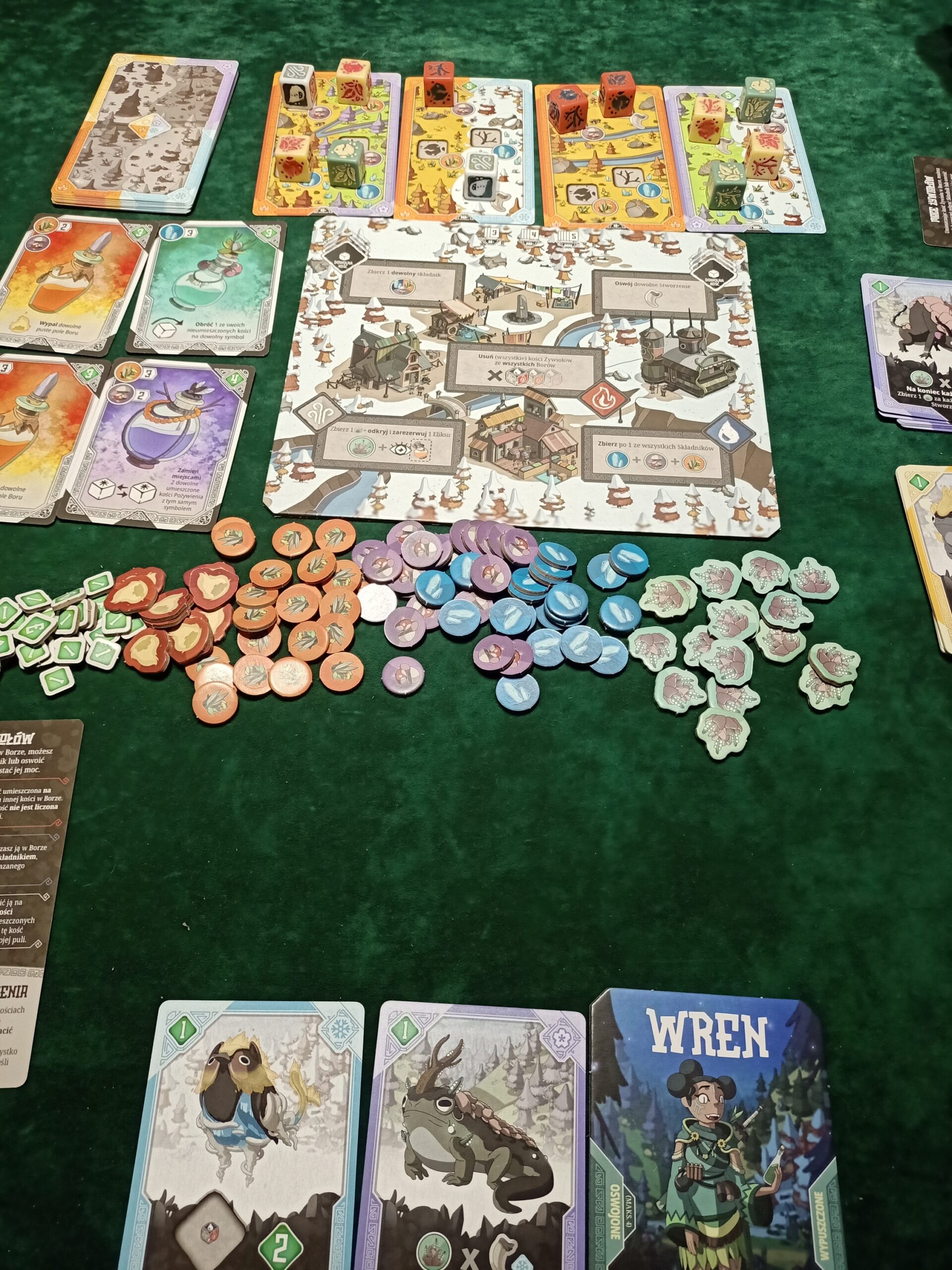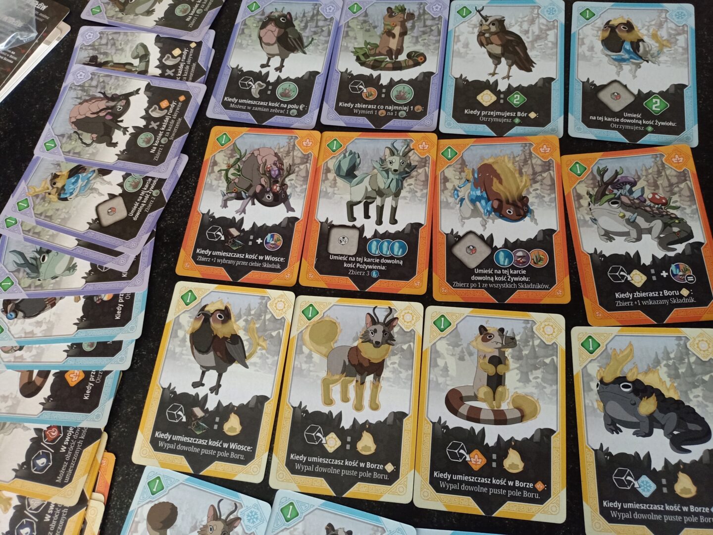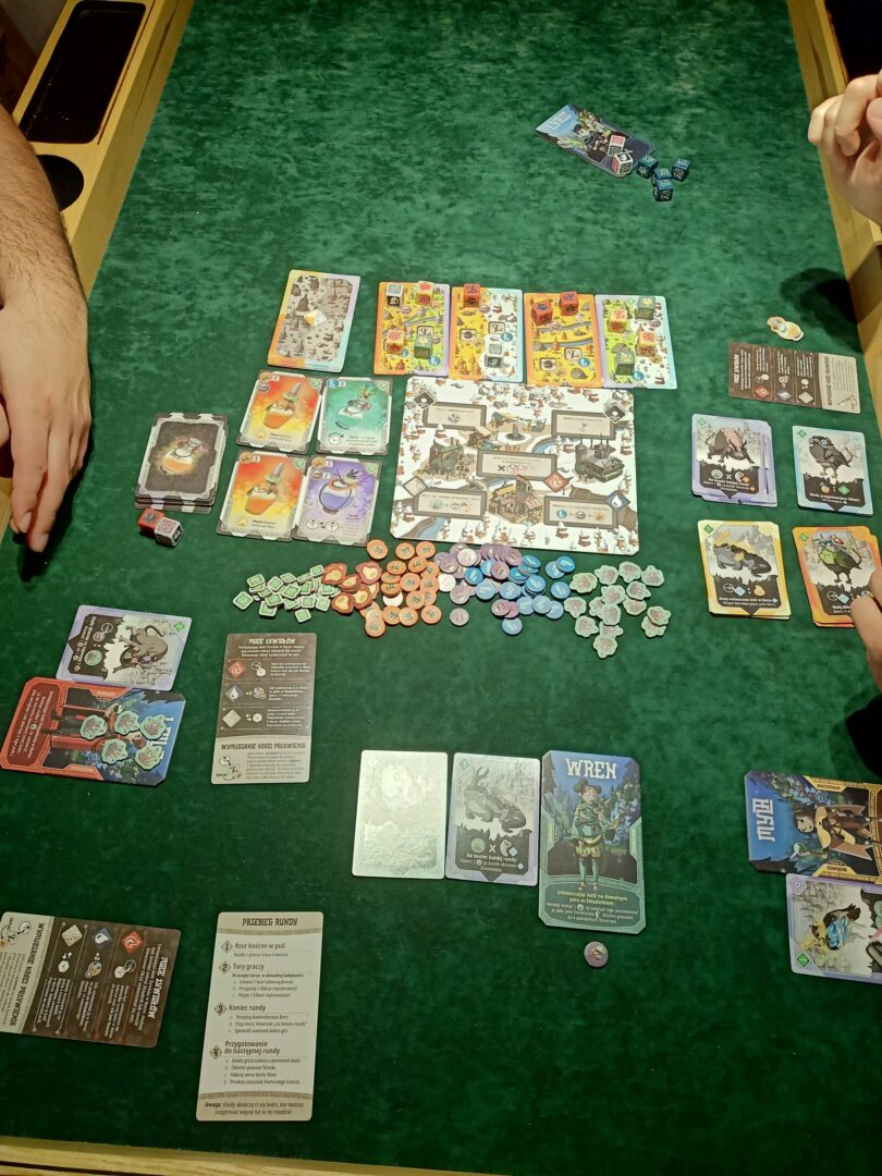 Na tym nie koniec atrakcji związanych z mechanikami gry. Możemy oswajać dzikie zwierzęta. Ich karty posiadają swoje własne zasady, które w połączeniu z umiejętnościami naszych magów bądź pól wioski stworzą nasze silniczki. Wygenerujemy tak zasoby, a nawet punkty zwycięstwa.