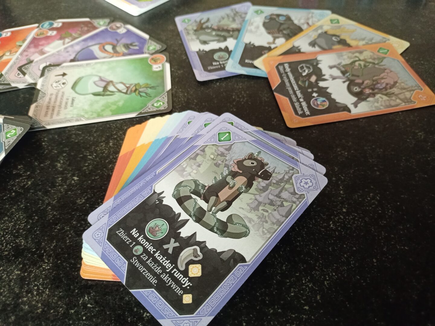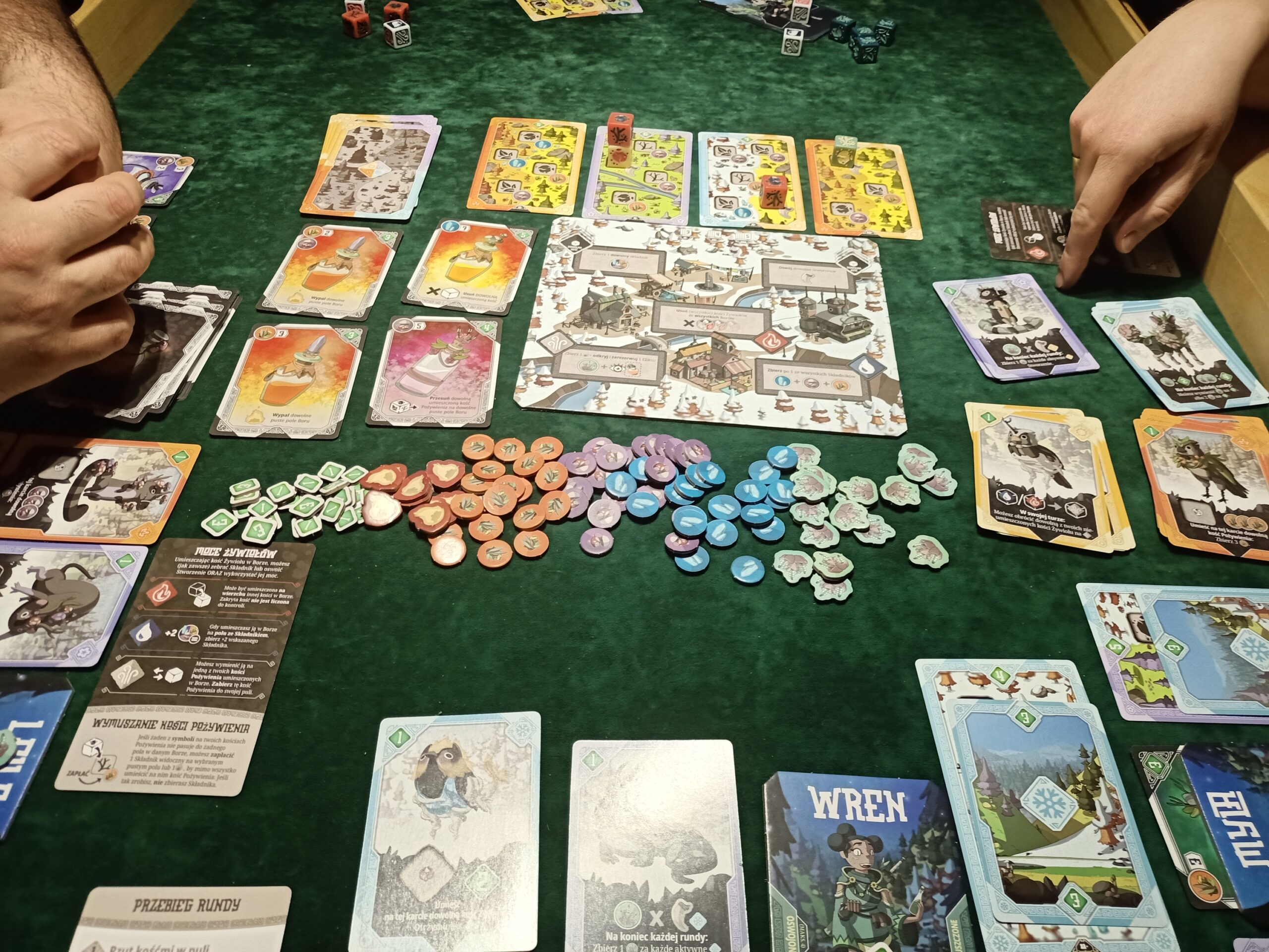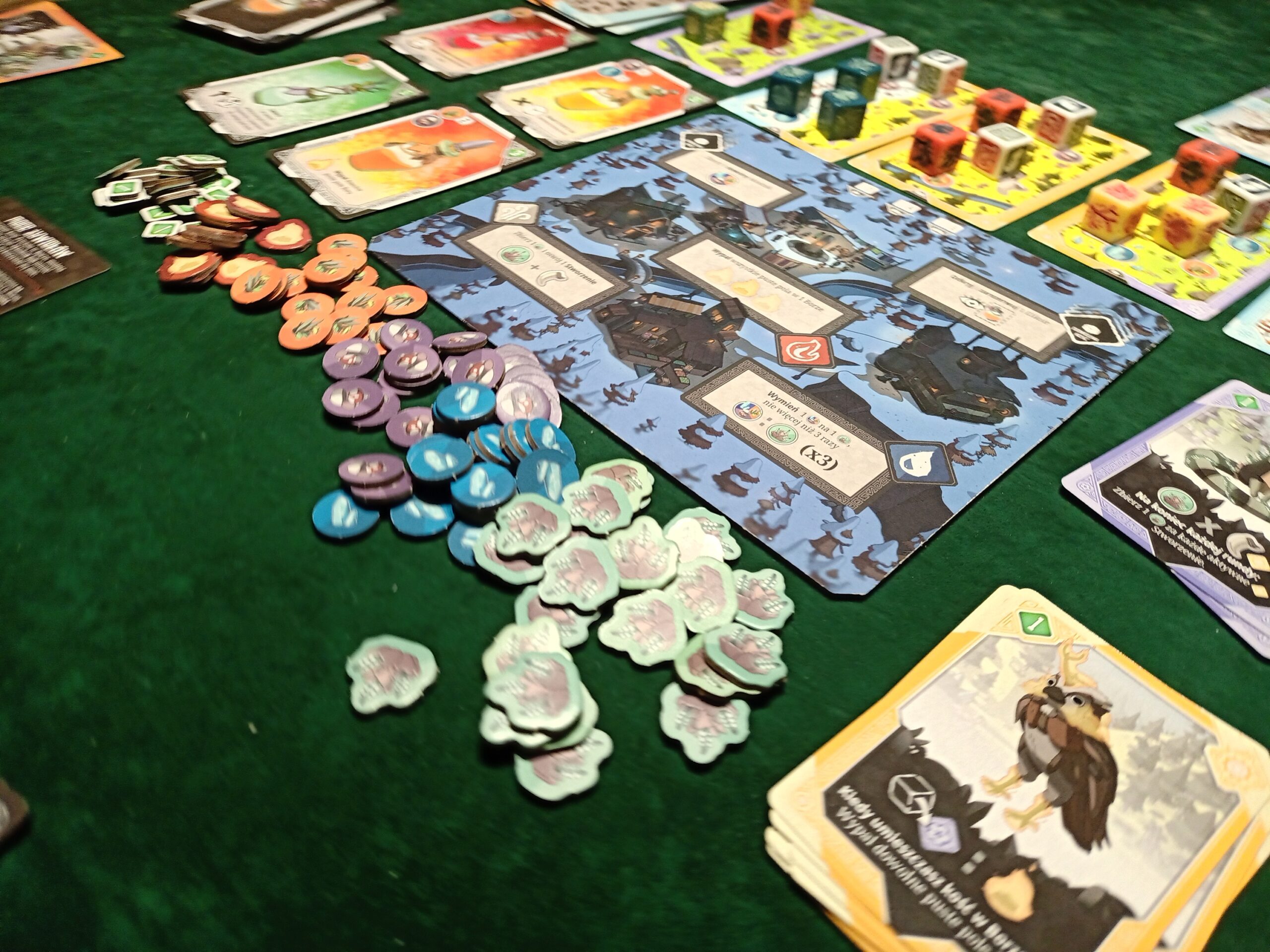 Na tym nie koniec atrakcji związanych z mechanikami gry. Możemy oswajać dzikie zwierzęta. Ich karty posiadają swoje własne zasady, które w połączeniu z umiejętnościami naszych magów bądź pól wioski stworzą nasze silniczki. Wygenerujemy tak zasoby, a nawet punkty zwycięstwa.
