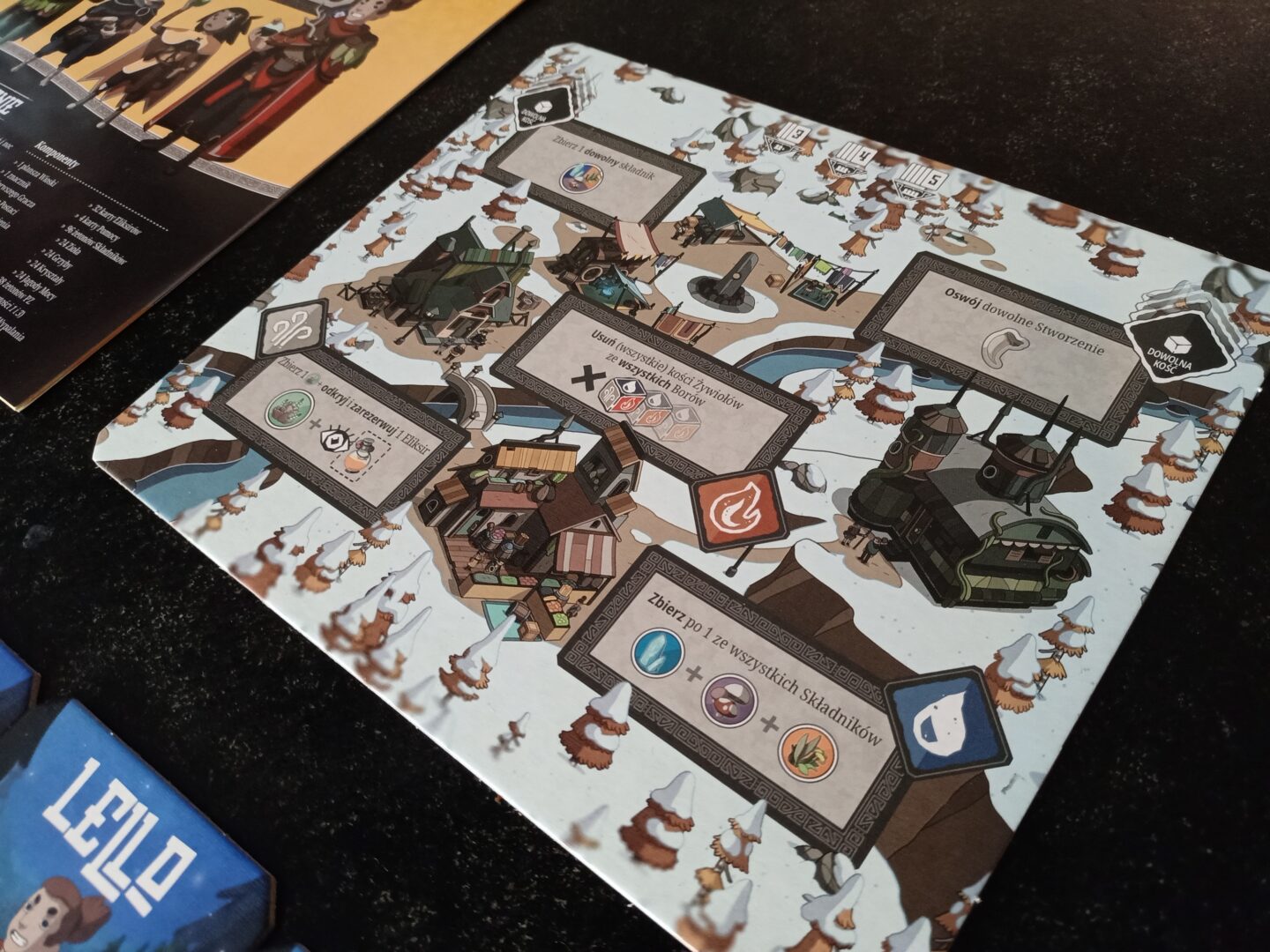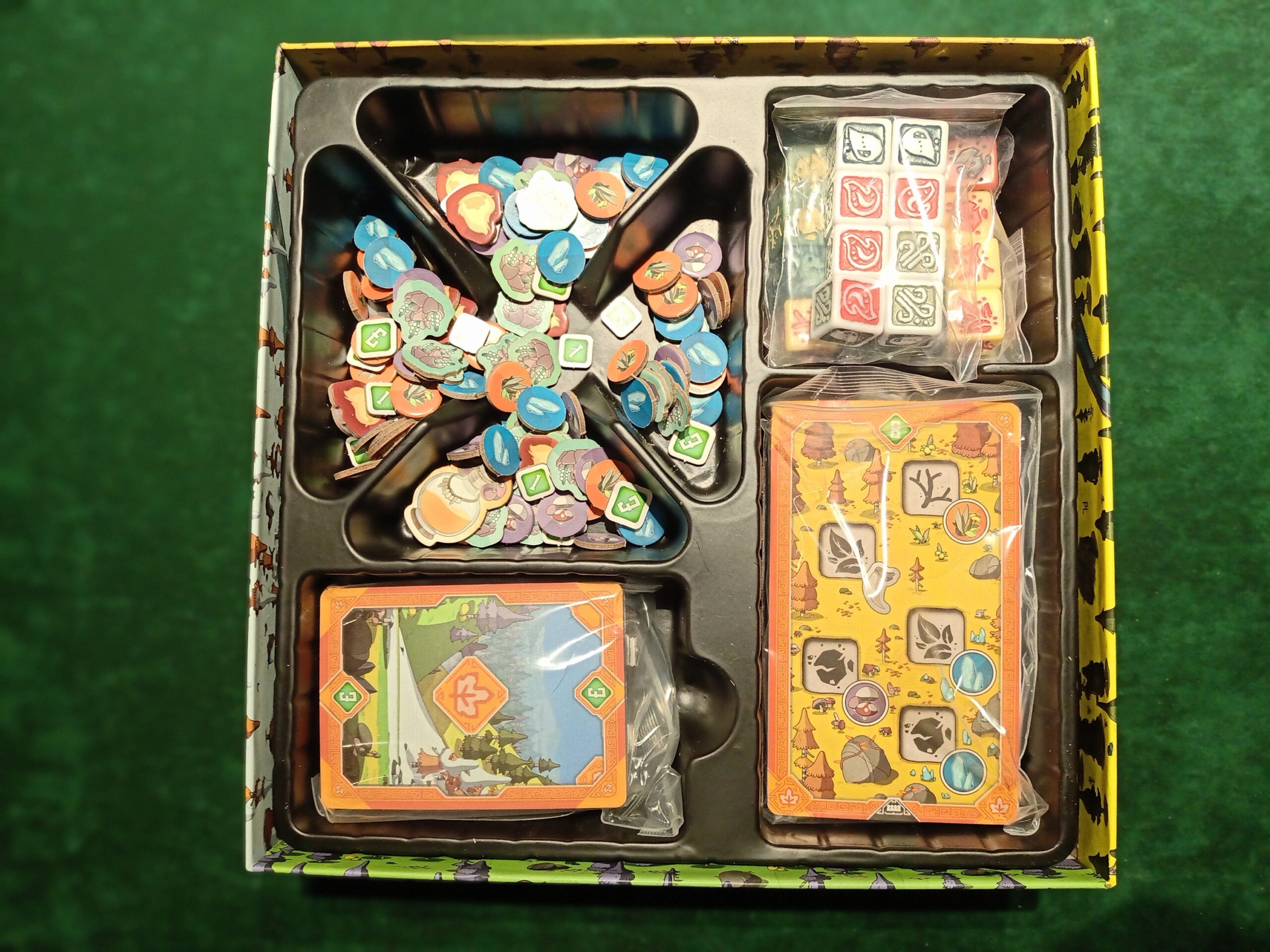 W pudełku znajdziemy 4 karty postaci naszych magów, planszę wioski, 24 kości pożywienia i żywiołów, 20 kart z borami, 36 kart leśnych stworzeń, 4 karty pomocy i całe morze żetonów (aż 144!), wszystko to w wyprasce. No i od tego ostatniego elementu zacznę dalszy opis, ponieważ niestety nie do końca dla mnie zagrał. W wyprasce jest duże wytłoczone miejsce, które nijak nie powstrzymuje żetonów od wymieszania się. Opakowanie zapewniało odpowiednią ilość miejsca, aby zrobić osobne komory, co przyspieszyłoby proces składania i rozkładania gry.