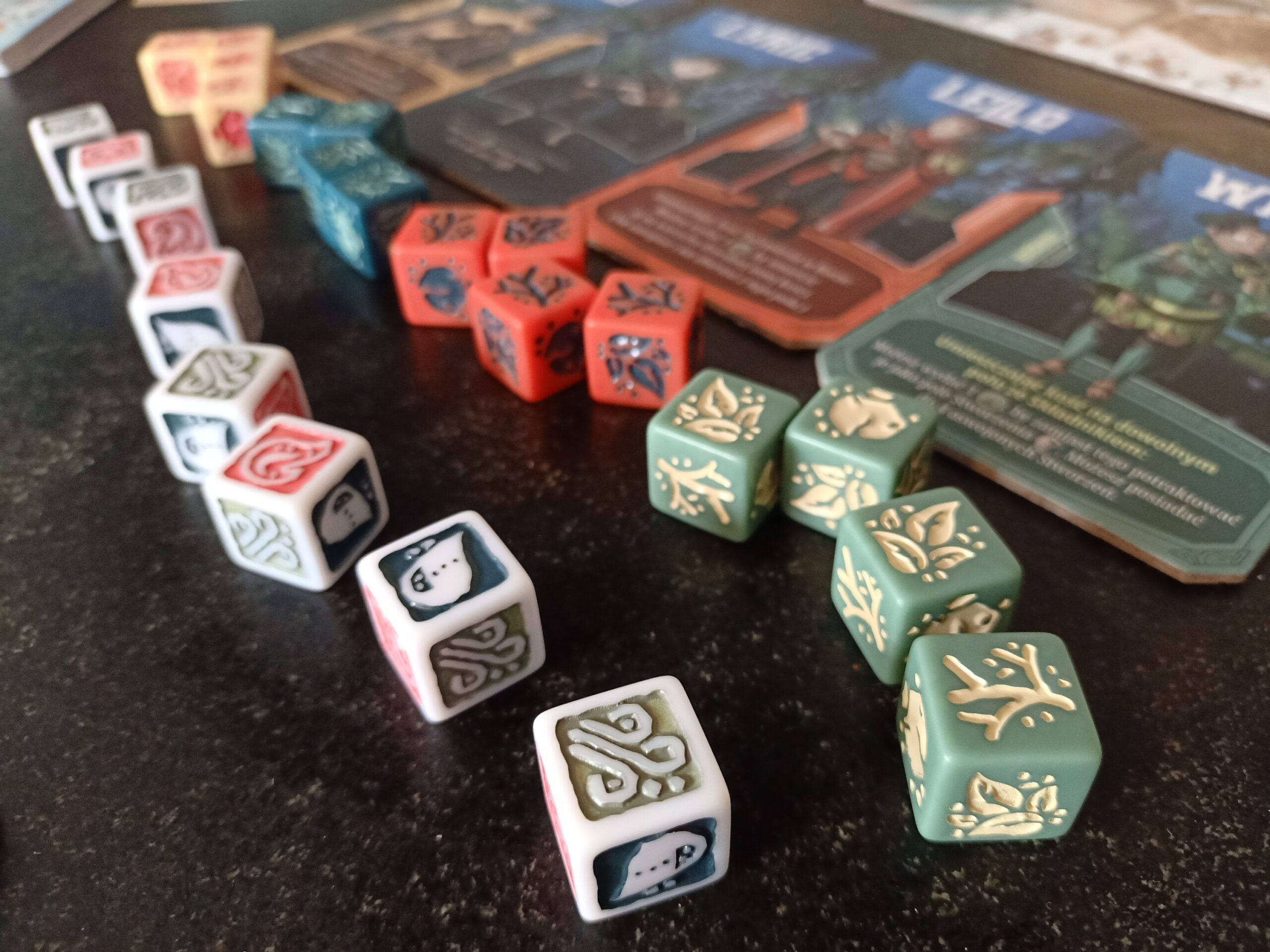 Nie mam zastrzeżeń do wykonania reszty elementów, standardowe gładkie karty nie były podatne na uszkodzenia. Prawdziwym hitem są przepiękne kości pożywienia i żywiołów, rzucanie nimi co rundę to bardzo przyjemny element gry. Z kolei żetony są łatwe do odróżnienia dzięki znowu czytelnym i ładnym obrazom… o wszystkich grafikach mógłbym się jeszcze długo rozpisywać. Przejdźmy już jednak do ostatniego z elementów, który znajdziemy w pudełku, czyli instrukcji.