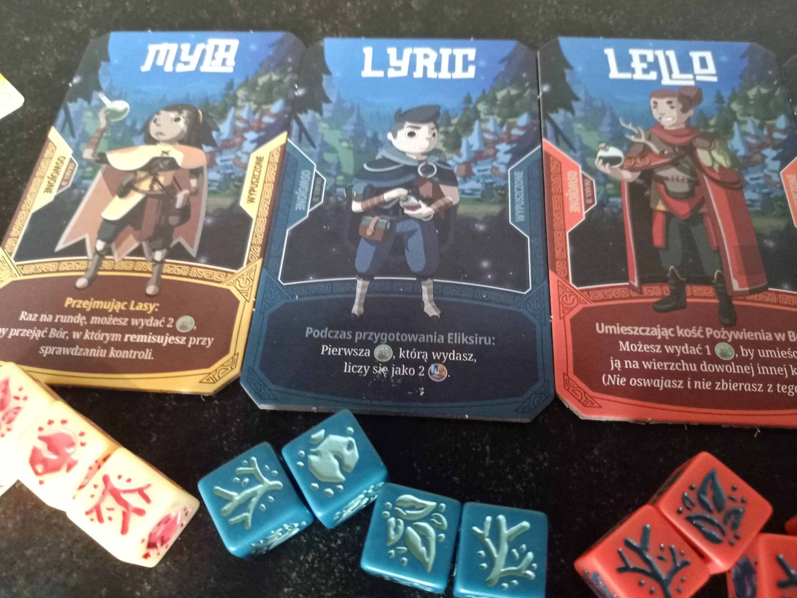Pierwszą rzeczą, jaką zrobi każdy gracz, to rzucenie 4 kośćmi pożywienia i żywiołów. Domyślacie się, że to właśnie tutaj rozstrzyga się konfrontacyjność tytułu. Rywalizując o ogólnie dostępne bory, będziemy umieszczać na nich swoje kości, palić kości innych graczy, przesuwać je, usuwać, a nawet wskakiwać swoją kością na ich kość. Mamy tu więc mechanikę area control, połączoną z worker placement.