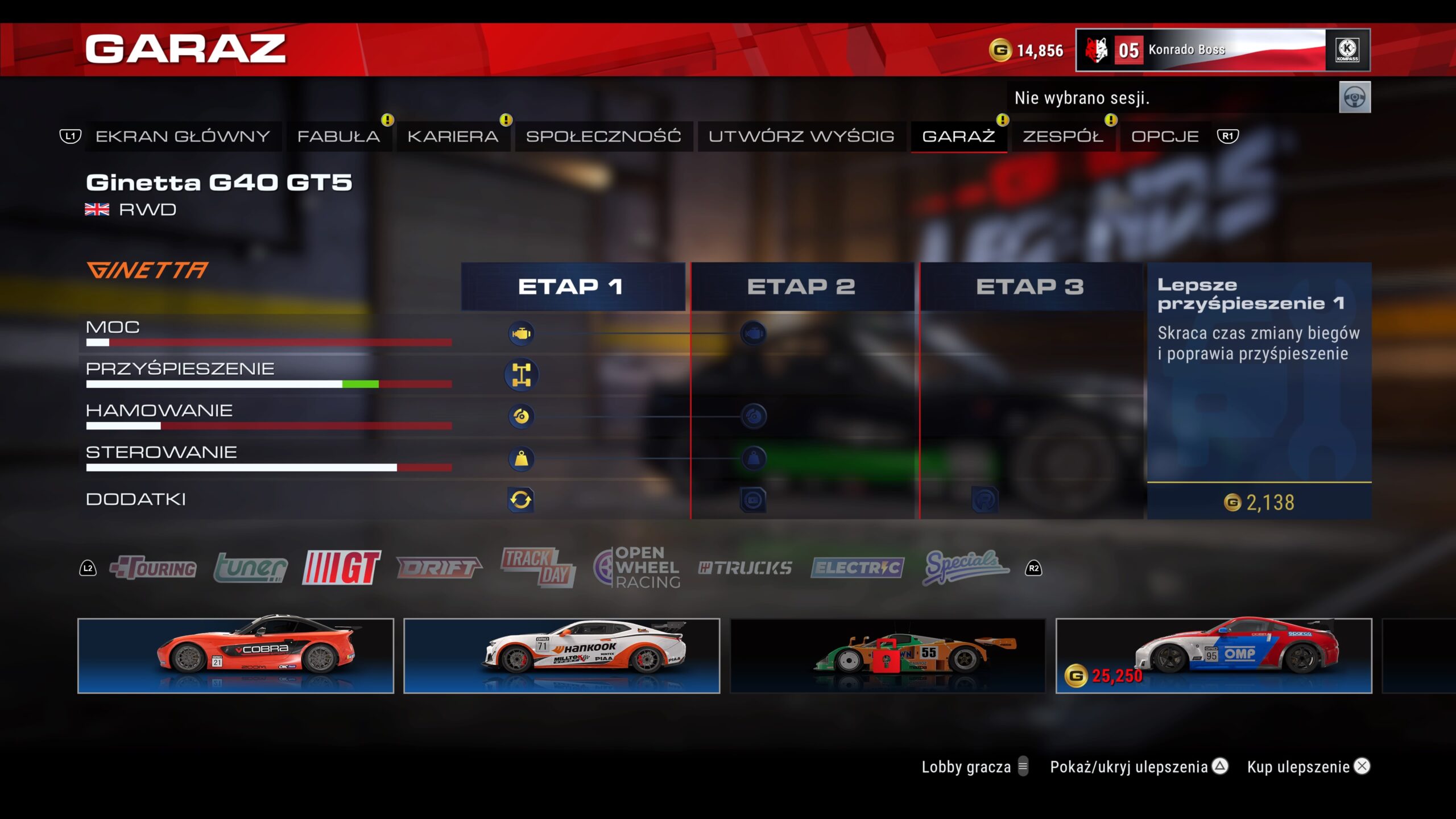 W Grid Legends w trakcie kariery możemy cały czas ulepszać i rozwijać nasz zespół. Podobnie jak ma to miejsce w rozwijaniu drugiego kierowcy, także ulepszenia serwisowe podzielono na trzy kolumny. W kolumnie “uznanie” możemy zmniejszyć koszty napraw pojazdu oraz cenę zakupu nowych aut. W osiągach możemy zwiększyć procent naszego wynagrodzenia oraz zmniejszyć cenę ulepszeń. Ostatnia kolumna, nazwana “stary mistrz”, umożliwi nam dostęp do większej liczby ofert sponsorskich oraz pozwoli zdobywać od nich więcej kredytów. I jakby tego jeszcze było mało, to każde auto możemy ulepszyć pod kątem mocy, przyśpieszenia, hamowania oraz sterowania. Jednak nie montujemy tu pojedynczych części, jak ma to miejsce m.in. w Forza Horizon 5. Po prostu montujemy ulepszenia poziomu 1, 2 i 3 – przy czym dostęp do kolejnego poziomu ulepszeń otrzymamy dopiero po przejechaniu konkretnej liczby kilometrów.