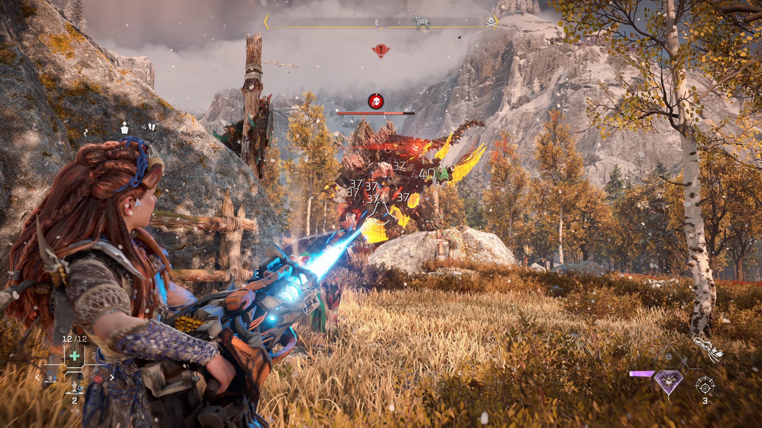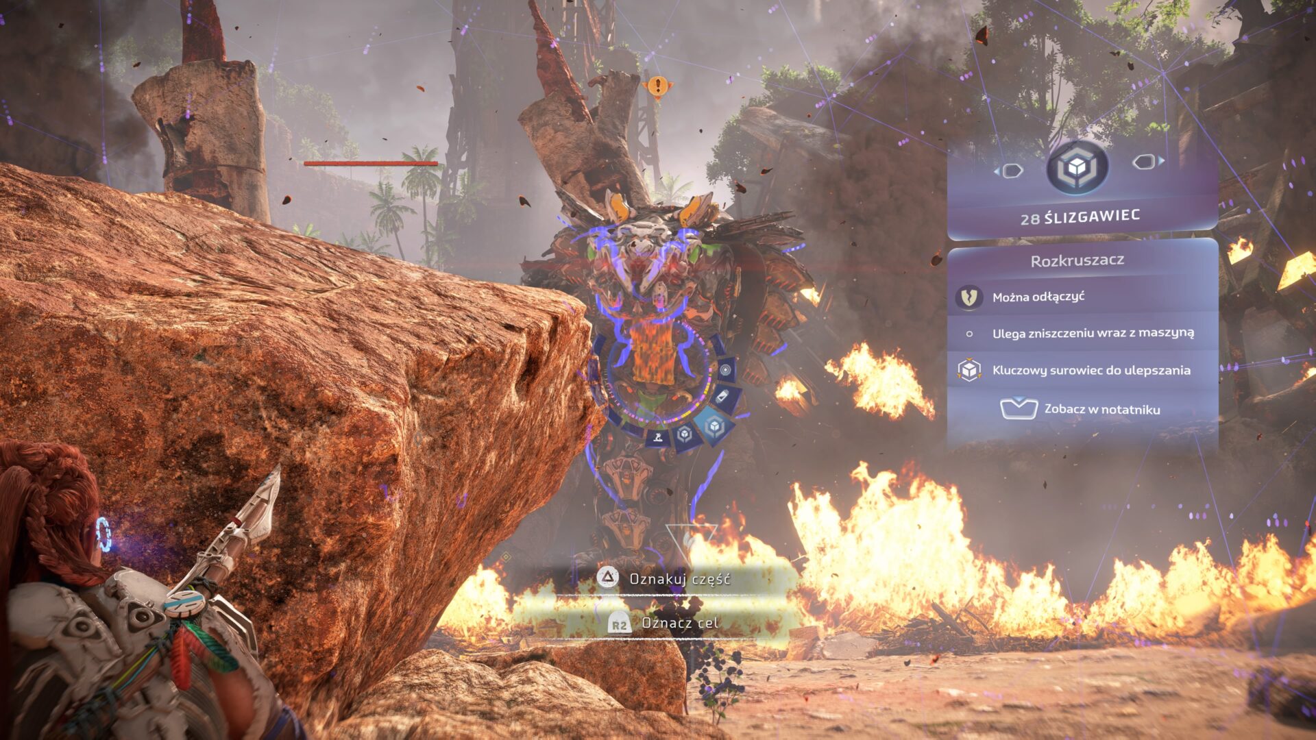 Sama walka mimo tego, że potrafi być widowiskowa i dostarcza sporo adrenaliny, to niestety też nieraz bardzo frustruje. Mam dwa problemy z prowadzoną walką. Pierwszy to brak blokady celu, a drugi to znikająca postać Aloy przy ścianach, drzewach, czy innych przeszkodach. Kamera w takich momentach mogłaby się zdecydowanie lepiej zachowywać. W trakcie wielu pojedynków zaobserwowałem też, że Aloy odnosi losowe obrażenia od tych samych ataków. Obrażenia od ogona lub skoków czasami zabierały 1/3, połowę lub nawet całe życie. Często też chowanie się za przeszkodami nie przynosiło efektów, gdyż ogony maszyn lub ich wielkie łapy przez nie przenikały, zadając Aloy obrażenia. Jest taka maszyna, która ukrywa się pod piaskiem, więc teoretycznie rudowłosa wojowniczka powinna być bezpieczna na skałach. Niestety, maszyna potrafiła przenikać przez ponad połowę takiej skały, raniąc Aloy. Na naszym kanale YouTube (tutaj) możecie zobaczyć pojedynek z maszynami w trybie jakości oraz poniżej w trybie wydajności: