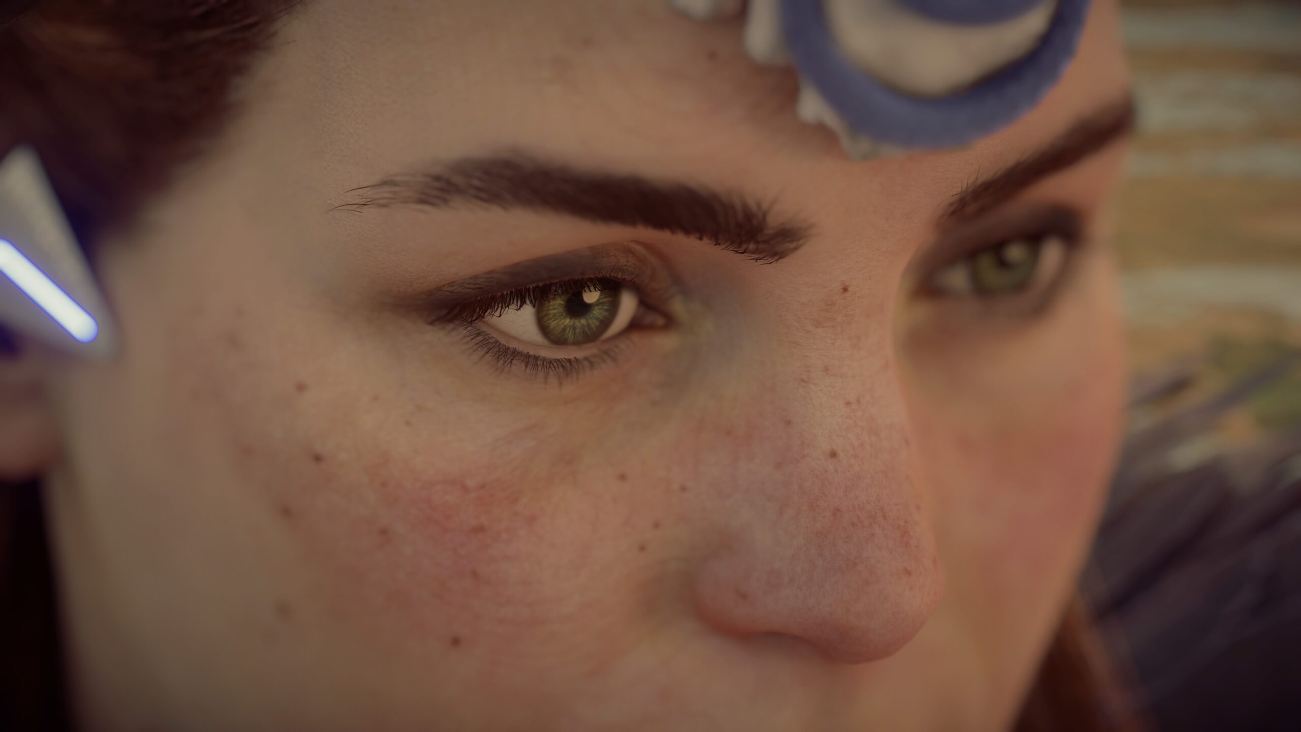 Tak realistycznie wykonanego nieba, wody i roślinności jeszcze nie widzieliście! Koniecznie sprawdźcie na naszym kanale YouTube pierwsze 30 minut z rozgrywki, aby przekonać się jak piękna i płynna jest ta gra. Sam model Aloy też przeszedł szereg gruntownych zmian. Dzięki ogromnej mocy obliczeniowej PS5 oraz dokładnemu trybowi foto możecie dostrzec najdrobniejsze szczegóły na twarzy Aloy. Kto by się spodziewał, że doczekamy czasów, gdy w grze wideo dostrzeżemy takie szczegóły jak meszek na twarzy kobiety, czy pory. Ta fotorealistyczna grafika ma już tak swoich zwolenników, jak i przeciwników. Z jednej strony gracze są zaszokowani, że kobieta ma włoski na twarzy i różne niedoskonałości. Natomiast z drugiej powoli już odchodzimy od idealnego modelu gładkiej skóry z poprzedniej generacji konsol.