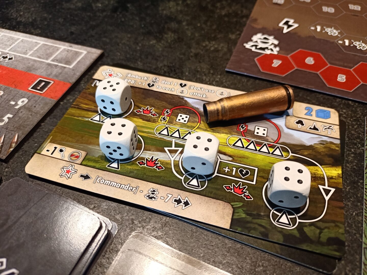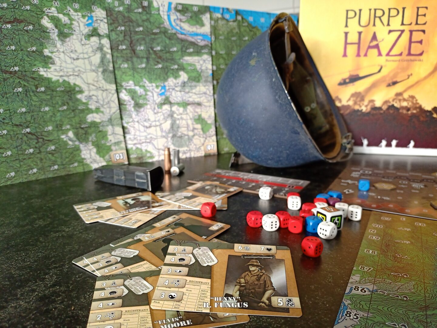 Rzuty kością — i jest ich w Purple Haze naprawdę sporo. W użytku jest (na szczęście) tylko jeden ich rodzaj, czyli K6. Kości zdeterminują, który żołnierz będzie celem ostrzału Wietkongu albo specjalnego wydarzenia. Dzięki testom dowiemy się, jak skuteczny był nasz ostrzał, czy użycie specjalnej umiejętności.