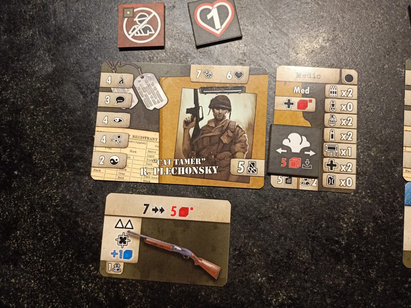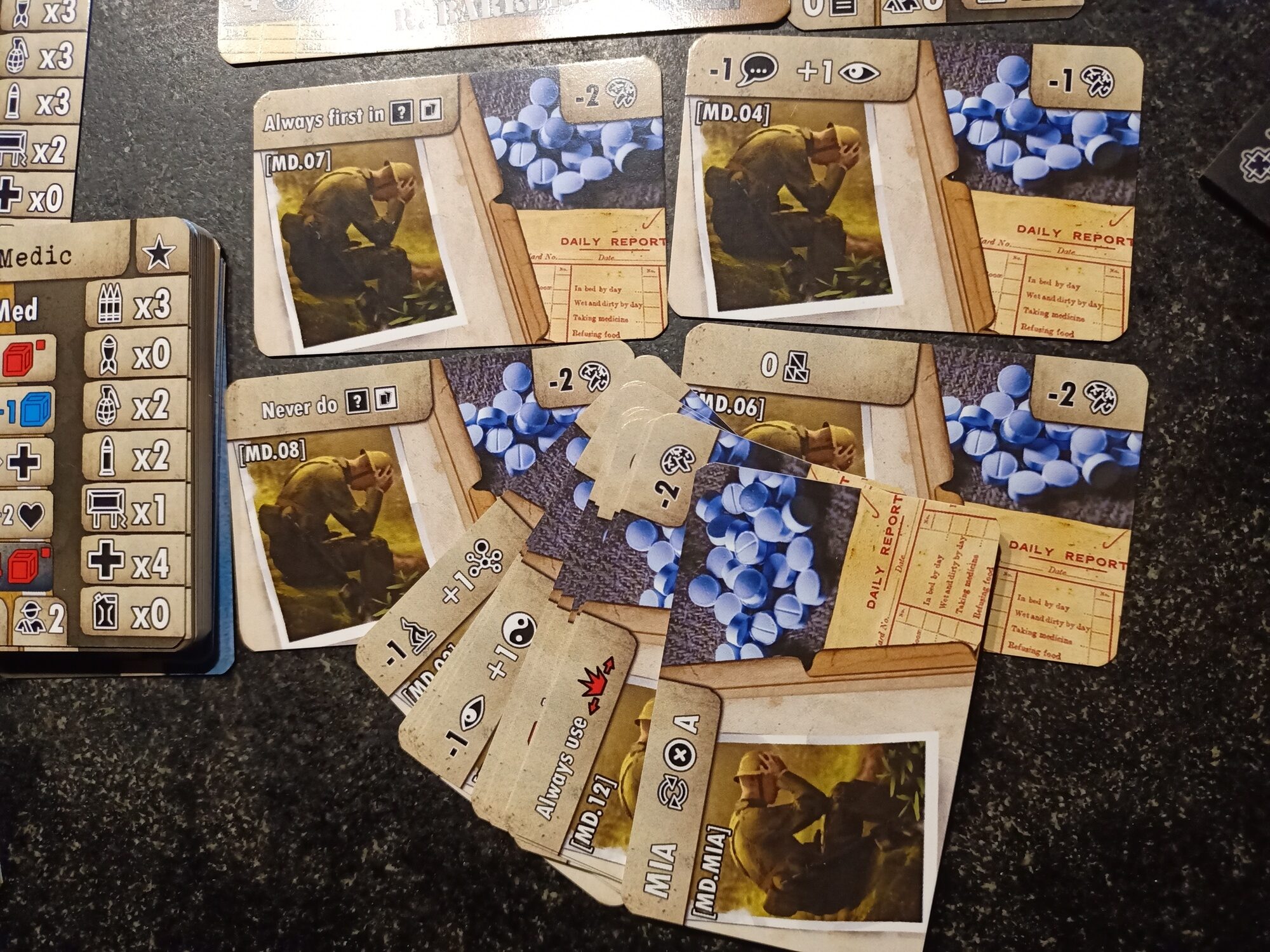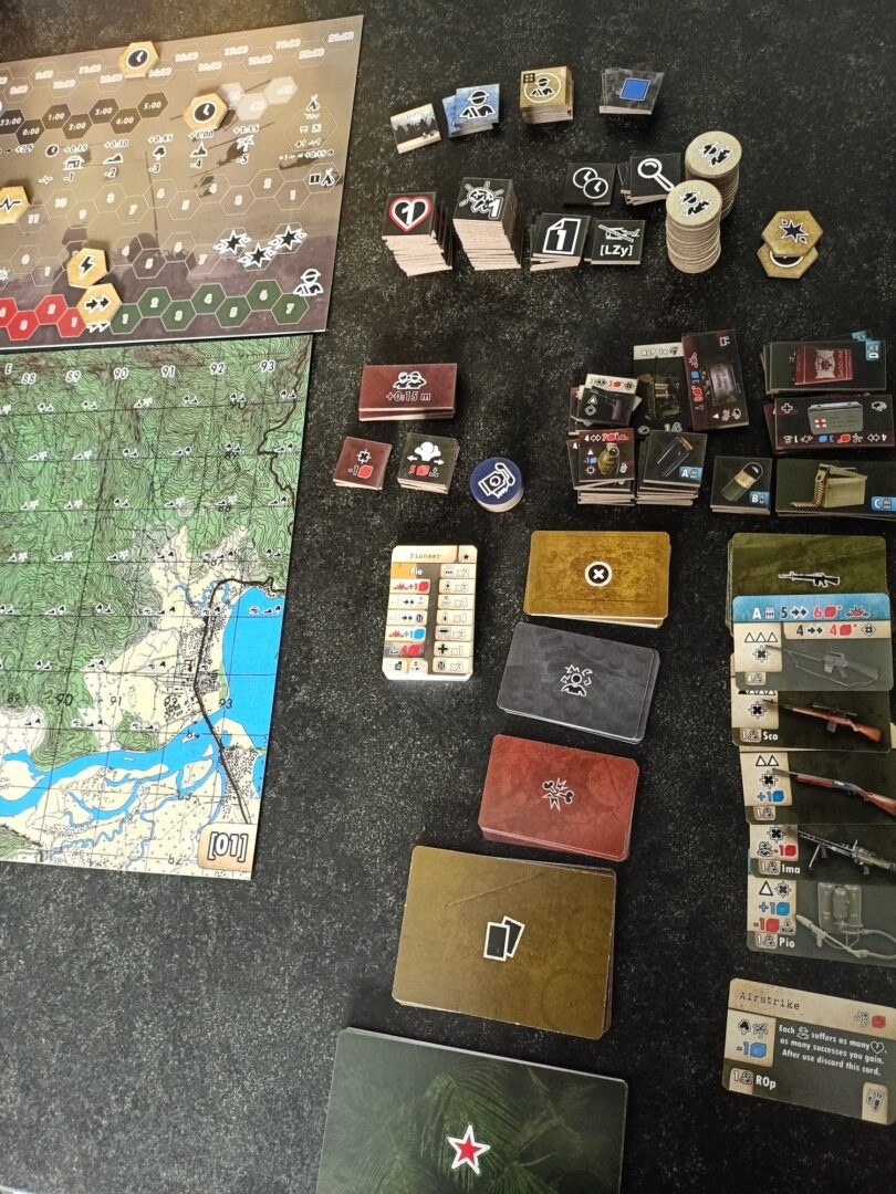Wracając do wyglądu Purple Haze, przede wszystkim świetnie prezentują się karty postaci, wraz z ich specjalizacjami. Widzimy przed sobą jakby teczkę osobową żołnierza. Widać też, że dochodzić mogą do niej różne „wpisy”. Będzie to na przykład broń, którą obsługuje, czy też choroby psychiczne, których może nabawić się w boju… Jak możecie zobaczyć na zdjęciach w tym momencie Purple Haze to nie tylko standardowe karty. W grze zobaczymy też małe decki w formacie Mini-American, a także większe Tarot (odpowiadające za starcia z wrogiem). Z pozostałych elementów mamy naprawdę dużo znaczników. Od amunicji, poprzez kafelki czasu, zmęczenia, aktywności wroga, po akcje Wietkongu podczas walki. Jestem pewien, że to nie ostateczny wygląd elementów gry, ale nawet na chwilę obecną Puple Haze nie ma się czego wstydzić!