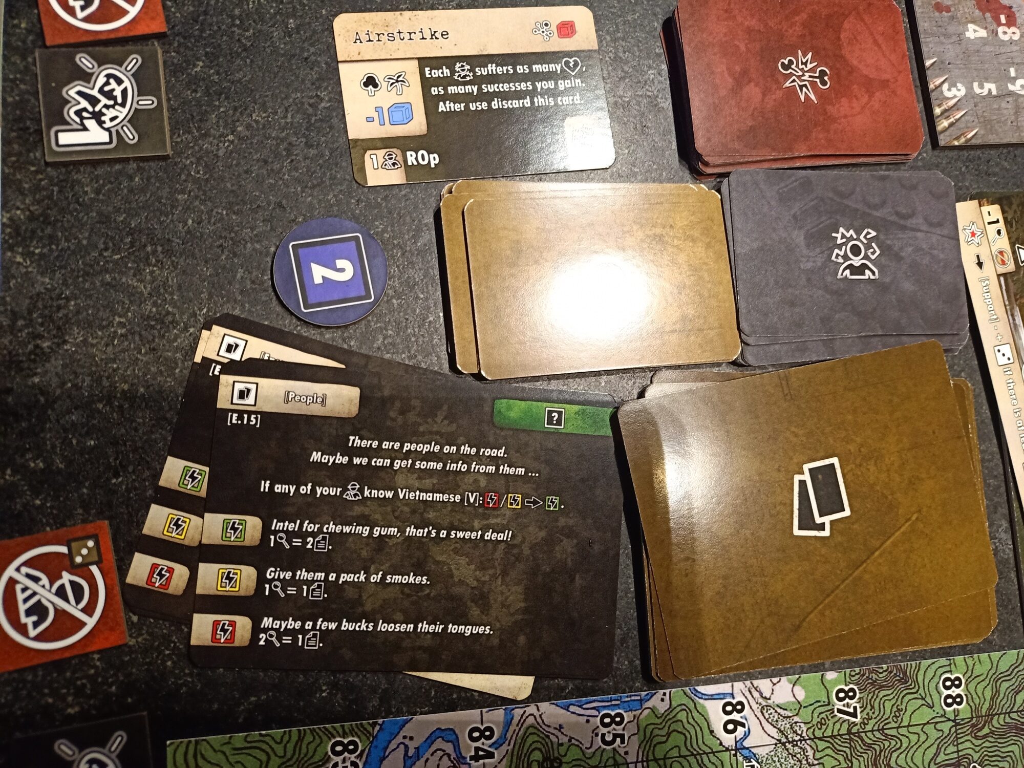 Kwestią, która w szczególności przypadła mi do gustu, obok widocznych powyżej kart wydarzeń, są elementy gry paragrafowej. Sytuacje opisane w paragrafach wystawią na próbę Wasze umiejętności taktyczne. Czy będziesz bronić wraku znalezionego śmigłowca? Czy może na dźwięk zbliżających się ludzi każesz oddziałowi się szybko wycofać? Podjęte decyzje, mogą mieć wymierne odzwierciedlenie podczas starcia. Co więcej, przeczytane już elementy scenariusza często powodują konieczność zapisania „słowa klucza”. Przy odkrywaniu kolejnych elementów scenariusza w przyszłości słowa te, mogą nam pomóc bądź utrudnić zadanie.