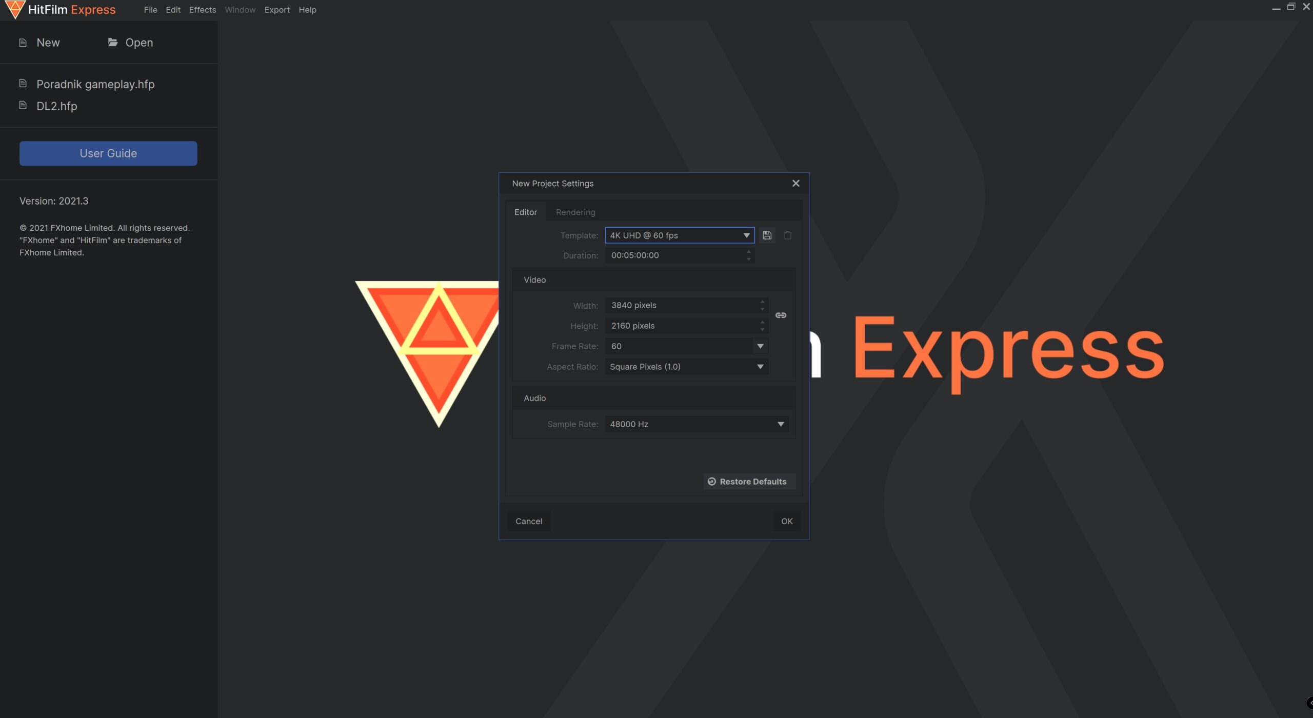 Do edycji wideo na nasz kanał YouTube posłużył nam darmowy, lecz bardzo rozbudowany edytor wideo – HitFilm Express. Pobierzemy go oczywiście ze strony producenta. Po instalacji i uruchomieniu aplikacji klikamy na New. Wszystkie nasze nagrania z PS5, czy Xbox Series X zapisane są w jakości 4K. W związku z tym w okienku „Template” wybieramy 4K UHD @ 60 fps (lub 30 fps), po czym klikamy OK. Aplikacja na pierwszy rzut oka może trochę przerażać, aczkolwiek to tylko pozory i podstawowe funkcje bez problemu szybko opanujecie.