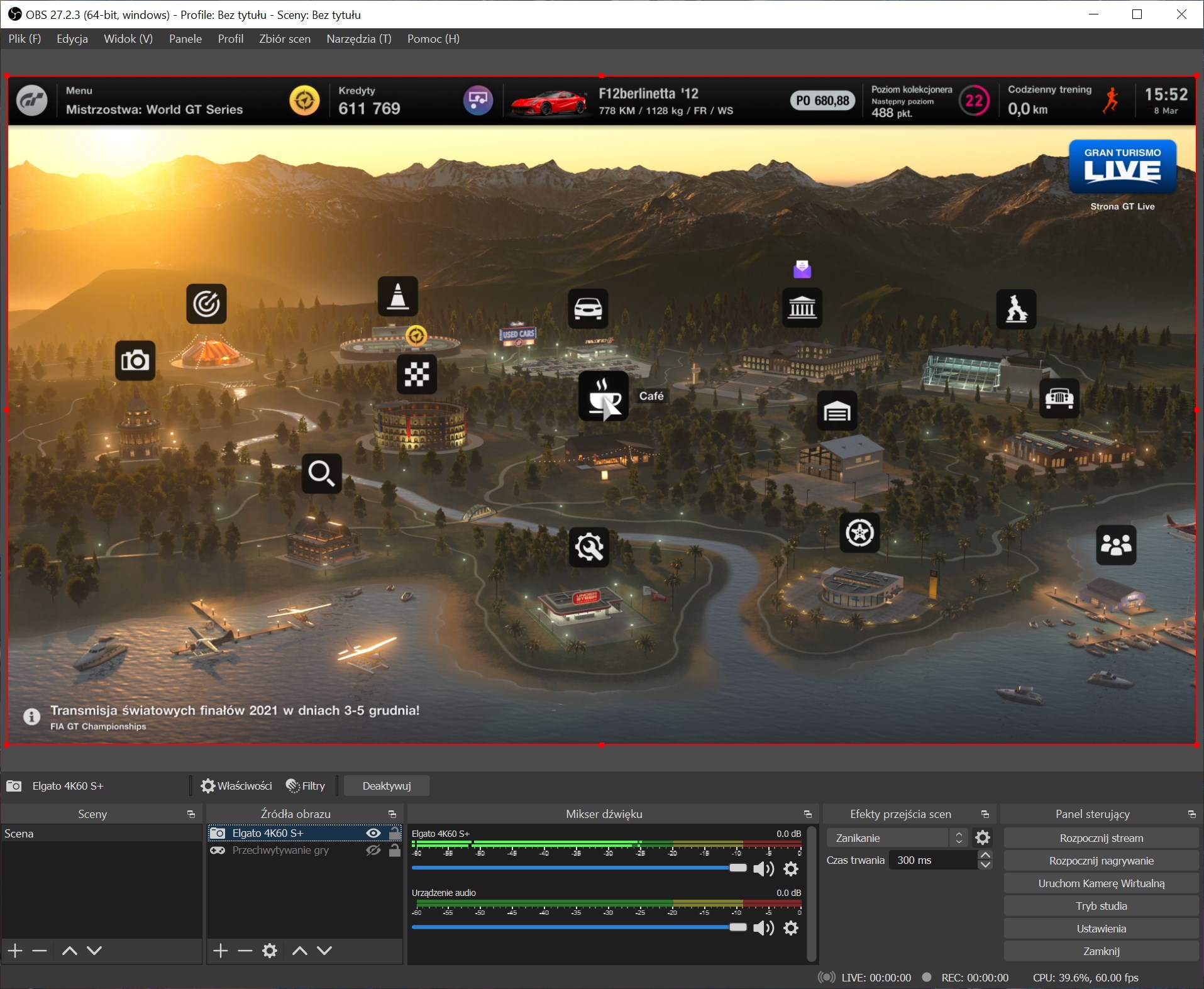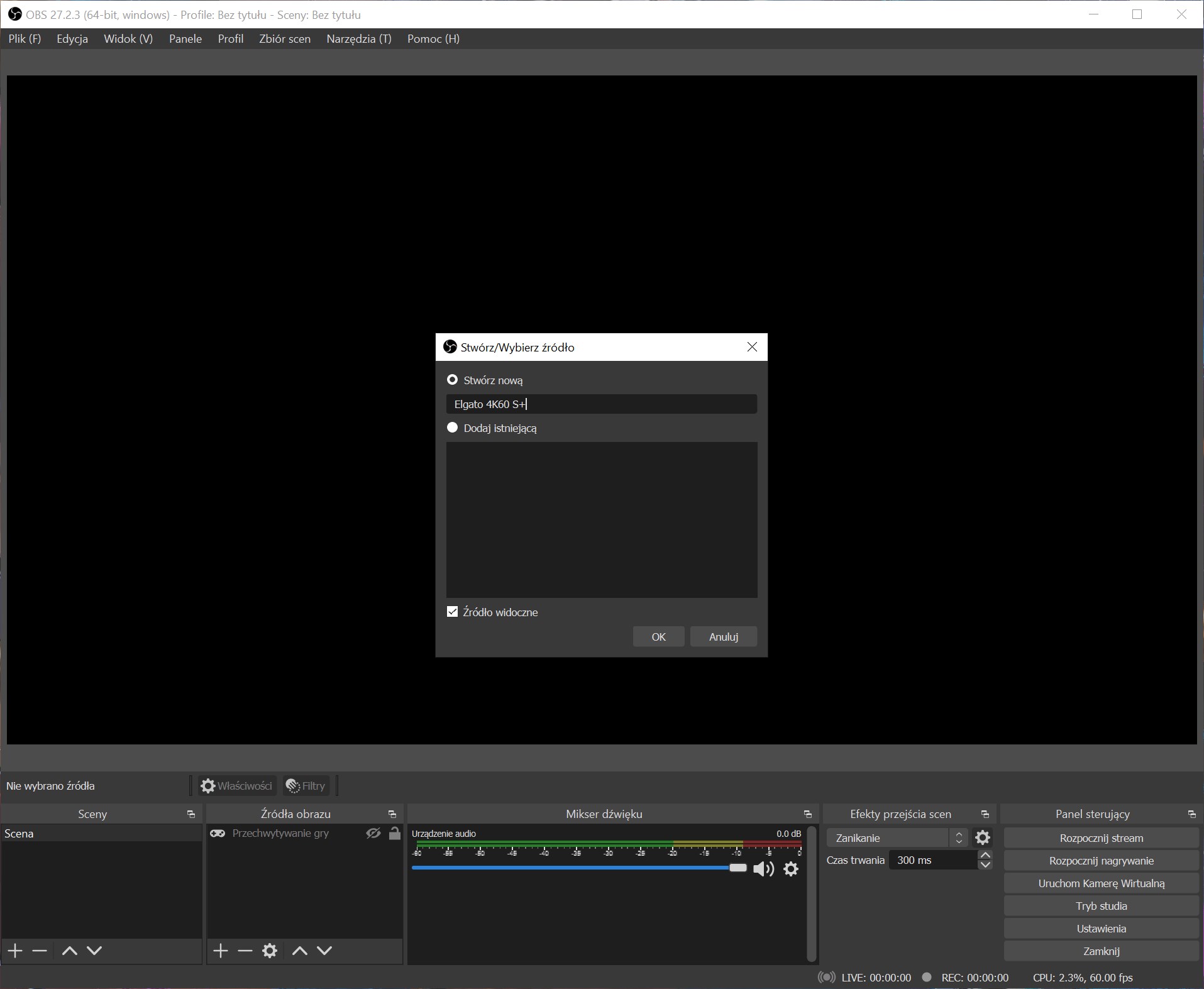 Wracamy teraz do głównego ekranu OBS-a. Tam musimy dodać nasz obraz z konsoli oraz kamerki. Zaczynamy od konsoli. Klikamy więc na plus w dolnym okienku Źródła obrazu i wybieramy urządzenia do przechwytywania. Wpisujemy nazwę naszej nagrywarki (Elgato 4K60 S)+ i klikamy OK. W kolumnie Urządzenie wybieramy Game Capture 4K60 S+. Po chwili powinien pokazać się obraz z naszej konsoli, a więc ponownie klikamy OK. Teraz obraz główny OBS-a powinien pokazywać ekran z konsoli.