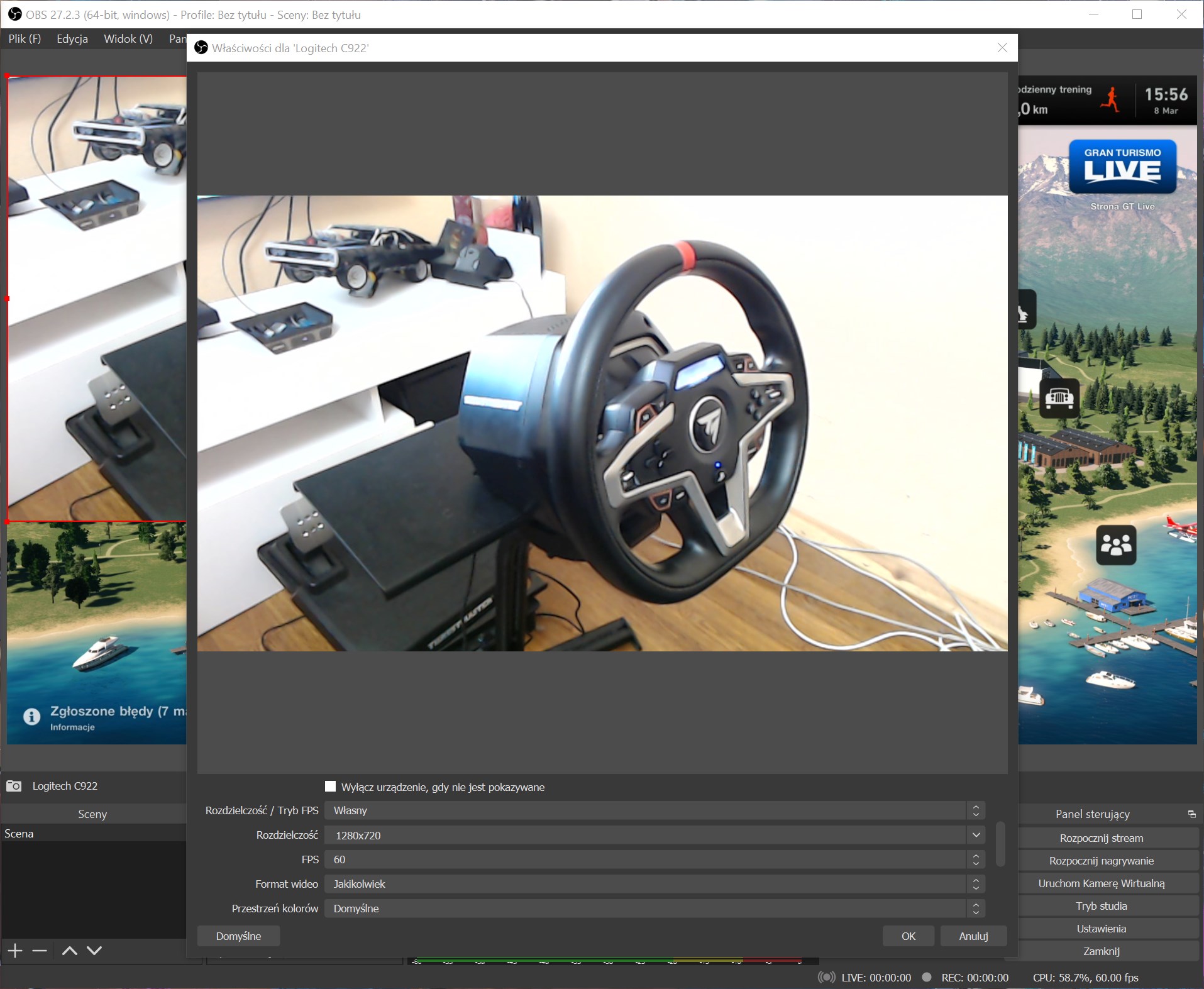 Następnie dodajemy obraz z kamerki podłączonej do PC. Wobec tego ponownie klikamy plus w dolnym okienku Źródła obrazu i wybieramy urządzenia do przechwytywania. Wpisujemy nazwę naszej kamerki i klikamy OK. W kolumnie Urządzenie wybieramy kamerkę internetową.Ustawiamy też, aby nagrywała w 60 klatkach kosztem np. niższej rozdzielczości obrazu. Teraz obraz główny OBS-a powinien pokazywać obraz z kamerki nałożony na ekran z konsoli.