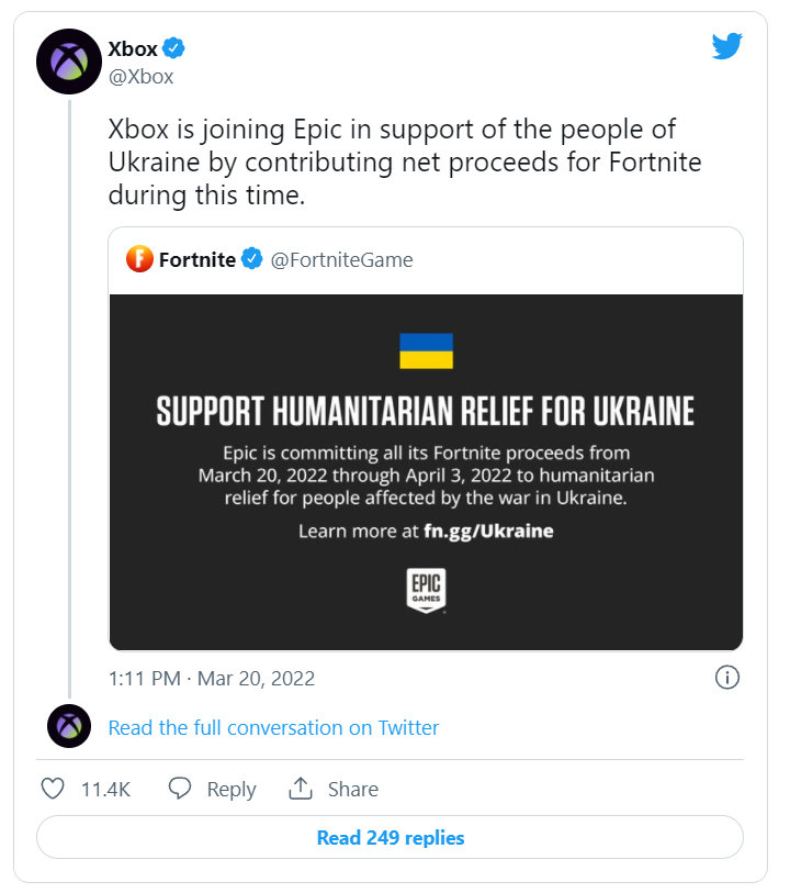 Epic Games ogłosiło wczoraj, że od 20 marca do 3 kwietnia 2022 wszystkie pieniądze z zakupów w Fortnicie trafią do organizacji pomagających Ukrainie. Do akcji dołączył się Xbox, który również przekaże zarobione w ten sposób pieniądze.