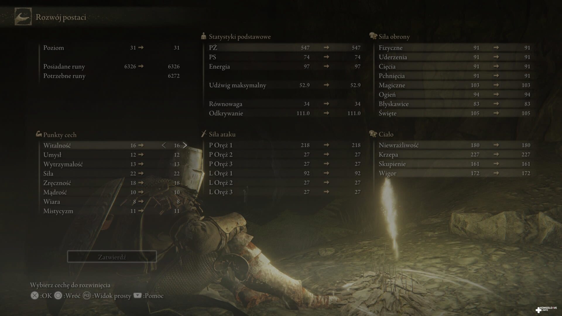 Jak wspomniałem wyżej, po wizycie u kobiety będziemy mogli ulepszać swoje zdolności i statystyki w tak zwanych miejscach łaski. Jest to nic innego jak odpowiednik ognisk z serii Dark Souls (występowały one nawet w grze karcianej, którą tutaj zrecenzowałem). Do ulepszenia swoich parametrów wymagane są runy – waluta, którą znajdujemy podczas zwiedzania świata, ale i która wypada z pokonanych przeciwników. Musimy więc decydować, na co lepiej ją przeznaczyć – na zakup nowego uzbrojenia i pancerza, inkantacji i schematów? A może jednak bardziej obiecujące byłoby zwiększenie naszej siły, zręczności lub witalności? Należy jednocześnie zaznaczyć, że różne klasy zaczynają przygodę z innym poziomem ogólnym oraz poziomami parametrów. Warto mieć to na uwadze, decydując się na swoją postać. Nie oznacza to bynajmniej, że wybór klasy jest wiążący. Nie ma żadnego problemu ze stworzeniem potężnego wojownika z maga, a zwinny złodziej może stać się ostatecznie połączeniem maga z żołnierzem. Klasa, na jaką się decydujemy sugeruje nam jedynie styl rozgrywki na początku przemierzania Ziem Pomiędzy.