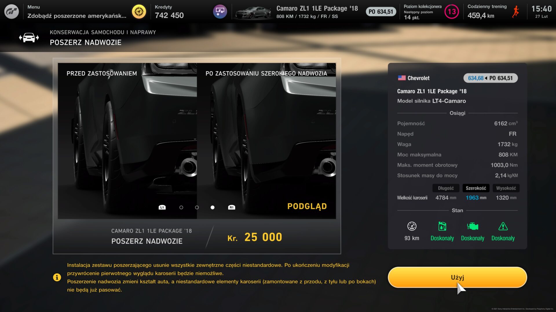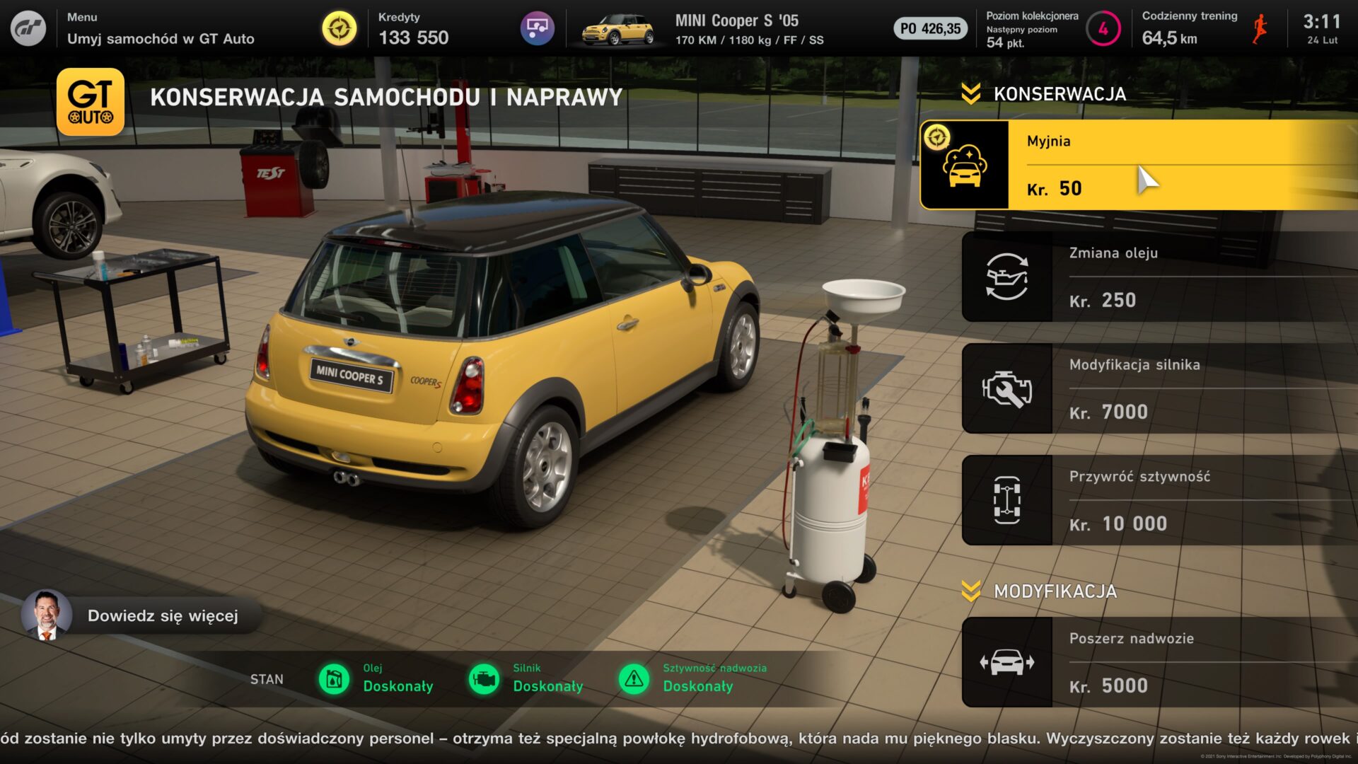 Samochodów w Gran Turismo 7 nie da się zniszczyć. Wprowadzono za to nieznaczne wgniecenia na blachach, plamy oleju, czy zabrudzenia i zniszczenia opon. Wszystko to możemy naprawić w GT Auto. Jest tam bowiem odpowiedni dział – “przegląd i serwisowanie”. Możemy tam umyć auto, wymienić olej, dokonać remontu silnika oraz naprawić poobijaną karoserię. Dodatkowo w tym miejscu możemy dokonać poszerzenia nadwozia.