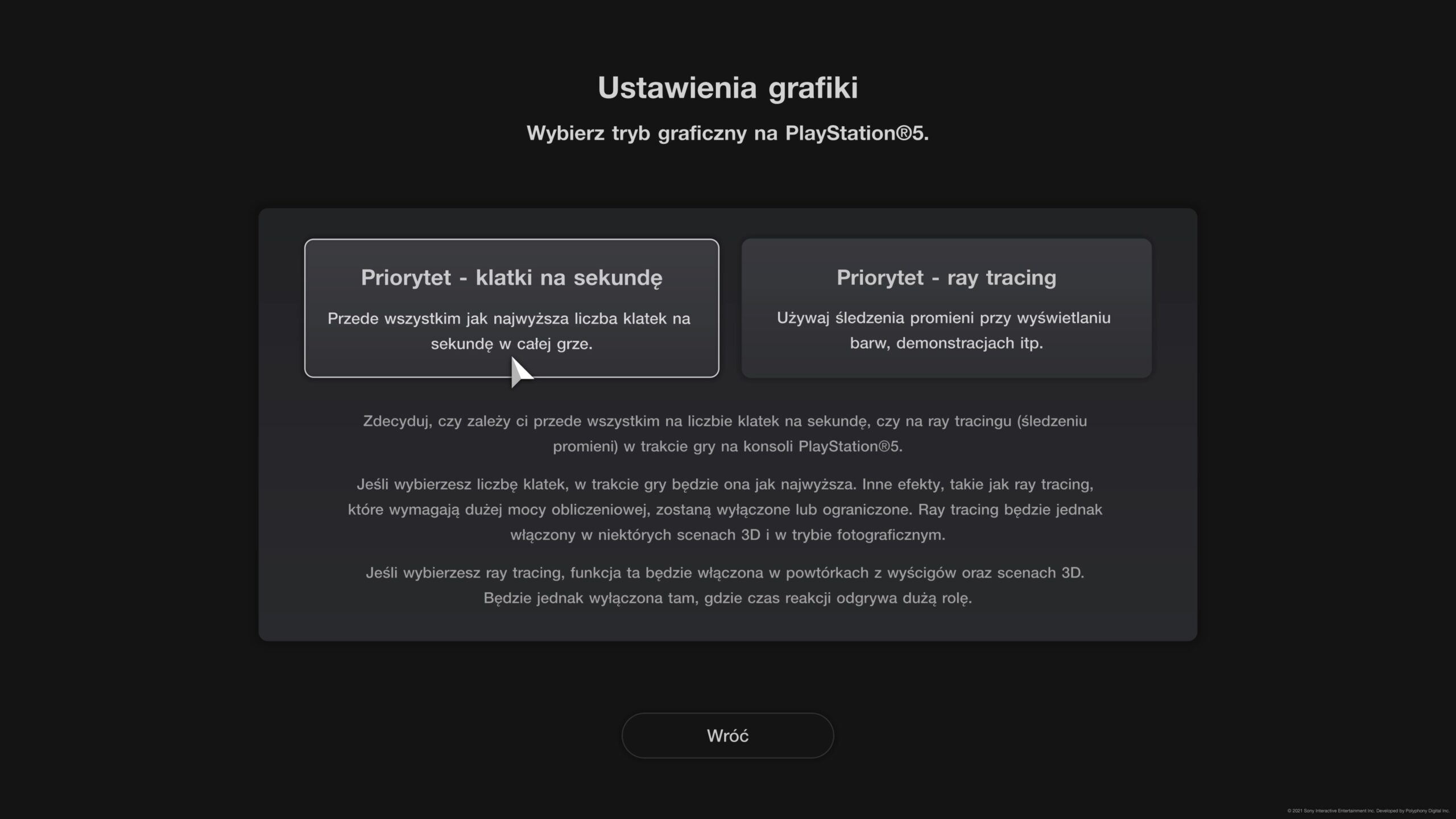 Gran Turismo 7 oferuje na PS5 dwa tryby wyświetlania. Jeden stawia na więcej klatek na sekundę i dynamiczną rozdzielczość, a drugi to oczywiście tryb śledzenia promieni. I tak naprawdę jest to wszystko mocno zakręcone, ponieważ w trybie klatek też występuje śledzenie promieni, choć głównie w trybie fotograficznym. Ustawienie z priorytetem na ray tracing pozwoli nam cieszyć się tymi efektami w powtórkach telewizyjnych wyścigów oraz scenach 3D, tj. w garażu, kawiarni oraz sklepach z samochodami i tuningiem. Bez wątpienia samochody z odpalonym śledzeniem promieni prezentują się fantastycznie, dzięki czemu gracze mogą przyjrzeć się nawet najdrobniejszym elementom karoserii. Troszkę natomiast rozczarowuje wykonanie wnętrz. Widać, ze tam już zabrakło czasu albo po prostu mocy konsoli, aby były równie piękne co auta na zewnątrz. Ale można też odnieść wrażenie, że im auto jest nowsze lub droższe, to ma bardziej szczegółowo wykonane wnętrze, niż podstawowe auta sportowe. Bez znaczenia, który tryb wybierzecie, to same wyścigi i wyzwania będą śmigać w rozdzielczości 4K z HDR i w 60 klatkach na sekundę na konsoli PlayStation 5.