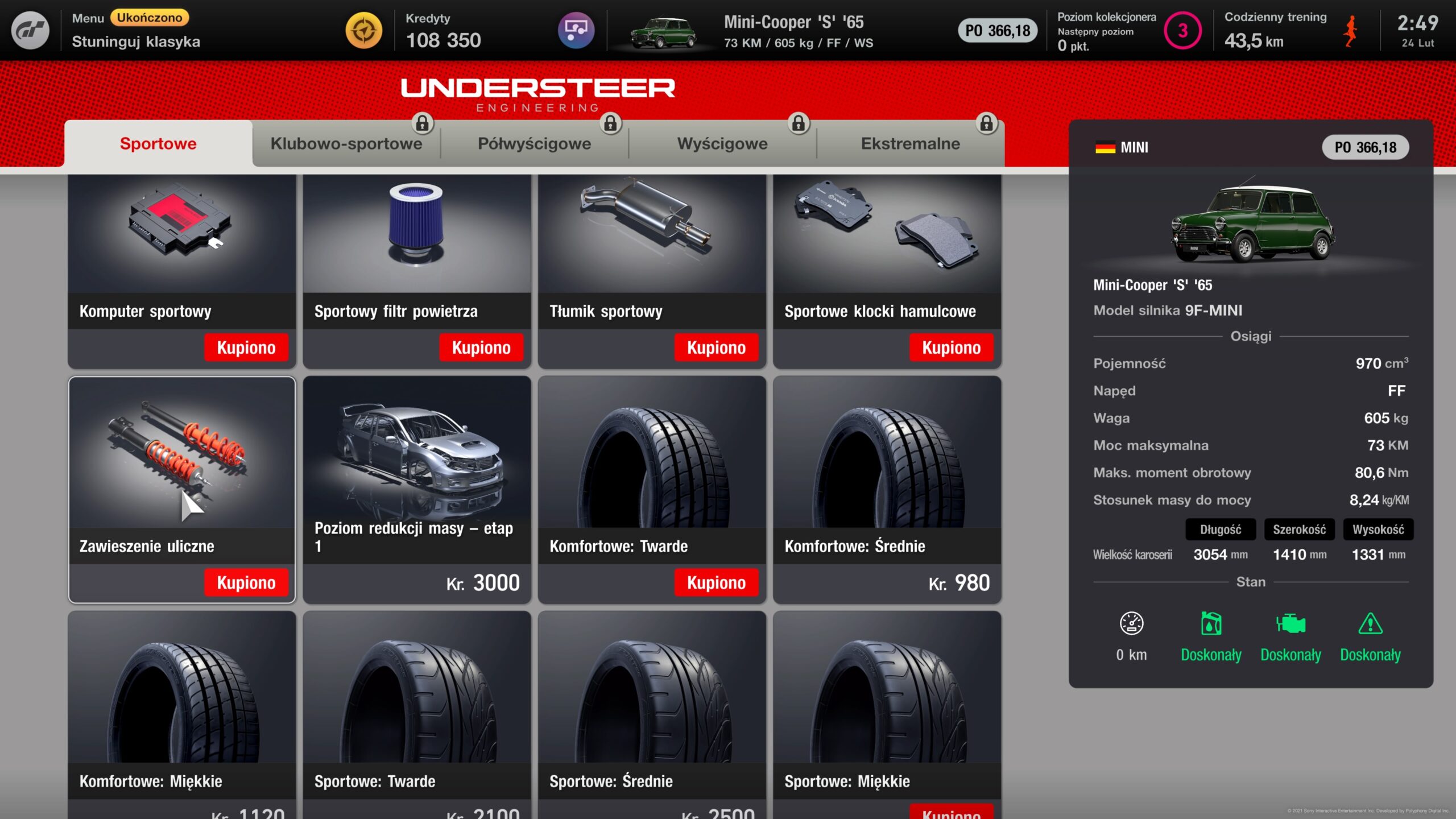 Sklep, moim zdaniem, jest zorganizowany trochę dziwnie. Jego “półki” są bowiem podzielone na pięć kategorii: sportowe, klubowe-sportowe, półwyścigowe, wyścigowe i ekstremalne. Do każdej z nich oraz lepszych części otrzymujemy dostęp wraz z wyższym poziomem kolekcjonera. Ten nabijamy po prostu z każdym kolejnym zdobytym autem. Każda nowa kupiona część podnosi nam PO (punkty osiągnięć), które są głównym wyznacznikiem mocy auta oraz wyznaczają limit w wyścigach. Niektórych części nie da się zamontować, a innych nie da się zdemontować. Często musimy więc dobrze przemyśleć nasz zakup. Największy wzrost PO otrzymamy, kupując miękkie opony sportowe lub wyścigowe. Absolutnie nie rozumiem, dlaczego opony deszczowe są tak drogie. Ich koszt przewyższa opony sportowe kilkukrotnie. Oczywiście do każdego auta musimy kupić osobny zestaw opon.