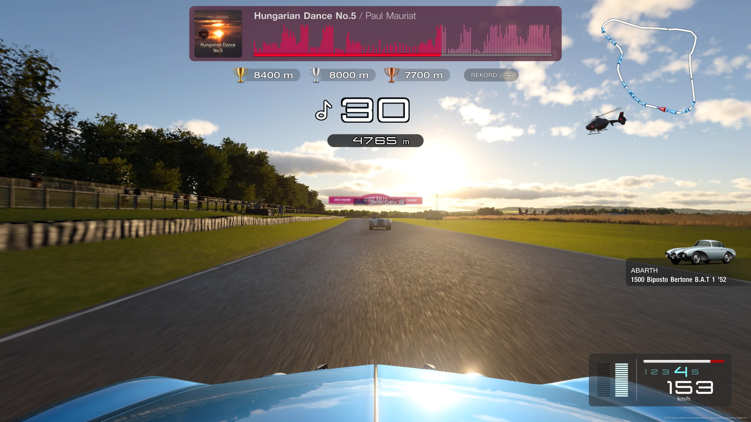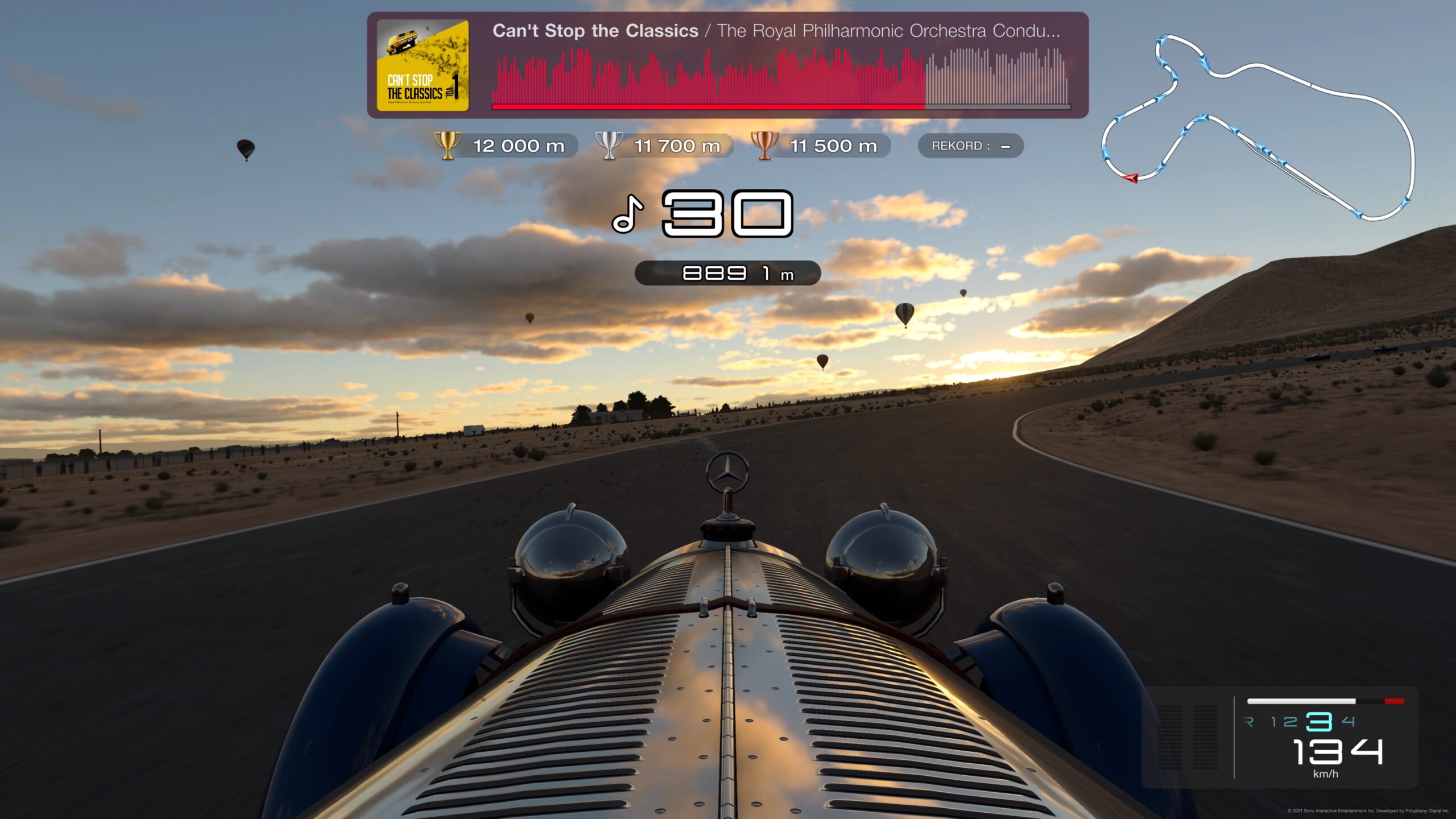 Gran Turismo 7 zajmuje na konsoli niemal 100 GB, toteż jej instalacja lub pobieranie niewątpliwie zajmie trochę czasu. Po pobraniu kilku GB będziecie mogli uruchomić grę i zagrać w rajd muzyczny. To wyścig z muzyką w tle z pokonywaniem punktów kontrolnych, w których oprócz dodatkowego czasu otrzymujemy kolejne nutki utworu. Aby zaliczyć trasę, musimy jechać tak długo, ile trwa utwór. W tym trybie jedziemy konkretnym klasycznym samochodem po wyznaczonej trasie. Jedyne, co możemy zmienić to podstawowe ustawienia samochodu oraz wspomagacze jazdy.