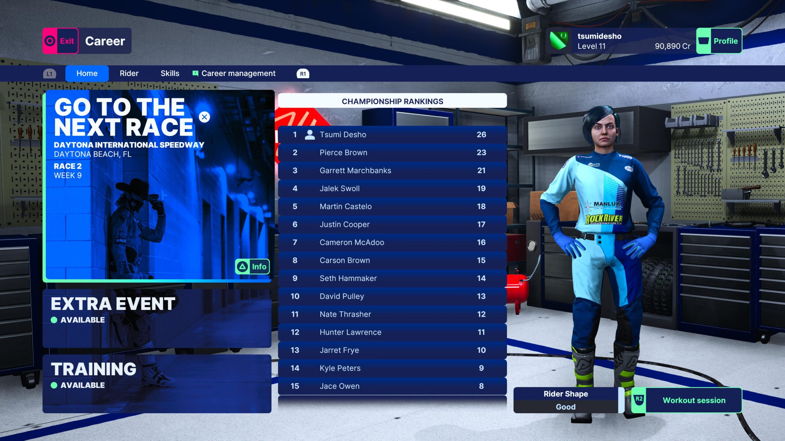 Ten tryb jest najbardziej rozbudowany i to na nim skupiłam całą swoją uwagę. Podpisujemy kontrakty z wybranym przez siebie sponsorem. Następnie po kilku startach możemy jednorazowo go przedłużyć lub wybrać innego sponsora. Zawsze zawarcie kontaktu kończyło się sukcesem. W trybie kariery nie tylko wspinamy się na szczyt. Otrzymujemy również jeszcze większą możliwość customizacji swojej zawodniczki / swojego zawodnika. Konkurujemy z innym zawodnikiem z drużyny i osiągamy zamierzone cele. Wraz z postępami w karierze dostępne będą treningi i jednorazowe eventy z zawodnikiem 1 na 1. Za zebrane punkty (Cr) możemy uzdrawiać naszego zawodnika 9 (tak) oraz ulepszać. Po każdym wygranym wyścigu zdobywamy PD, dzięki któremu rozbudowujemy drzewko umiejętności.