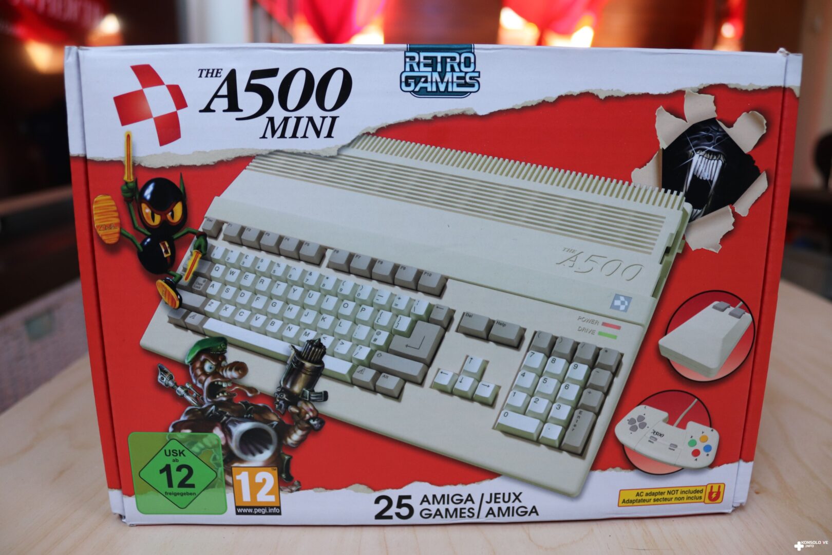 Mówi się co prawda, że nie należy oceniać książki po okładce i ja się z tym stwierdzeniem zdecydowanie zgadzam. Niemniej jednak nie sposób zaprzeczyć, że pierwsze wrażenie jest bardzo ważne. W przypadku sprzętu elektronicznego odnosimy je oczywiście po spojrzeniu na opakowanie produktu. Na szczęście, w mojej ocenie, THEA500 Mini nie ma się czego wstydzić. Jest bowiem zapakowane w dość schludny, elegancki i nie za duży karton. Mini w nazwie konsolki wydaje się wobec tego jak najbardziej uzasadnione. Na pierwszy plan wybija się oczywiście czerwień, której jest mnóstwo na opakowaniu. Może się to oczywiście kojarzyć z Nintendo, aczkolwiek to nie jedyna myśl, która może nam przyjść do głowy. Widzimy też bowiem głównego bohatera dzisiejszego testu, zwizualizowanego w charakterystycznym beżowym kolorze. Z pewnością każdy, kto jeszcze kilka dekad temu korzystał z komputerów i sprzętu elektronicznego pamięta standardowy kolor tamtych sprzętów. Producent testowanego urządzenia również zdaje sobie z tego sprawę i wyraźnie widać przywiązanie do tamtych czasów. Na tylnej stronie opakowanie znajdziemy oczywiście listę zainstalowanych gier. Karton ma wymiary 25,5 cm x 17,5 cm x 8 cm. Otwórzmy go więc i zobaczmy, czym przyjdzie nam spędzić – oby – mnóstwo godzin.
