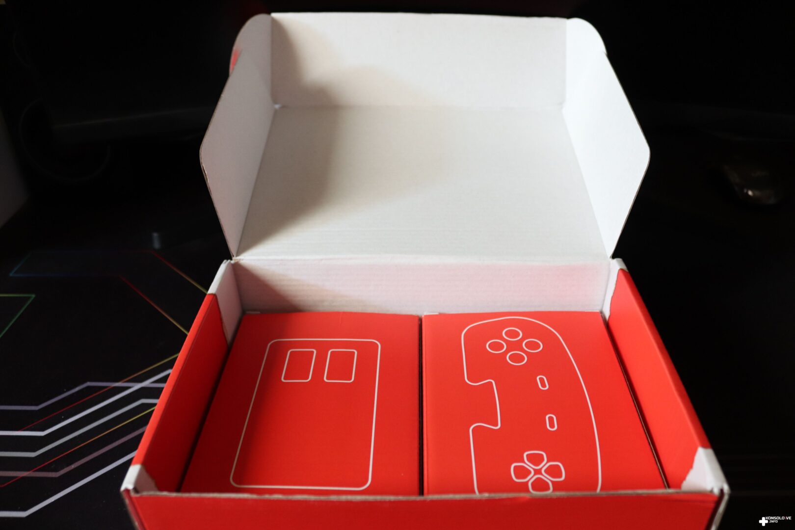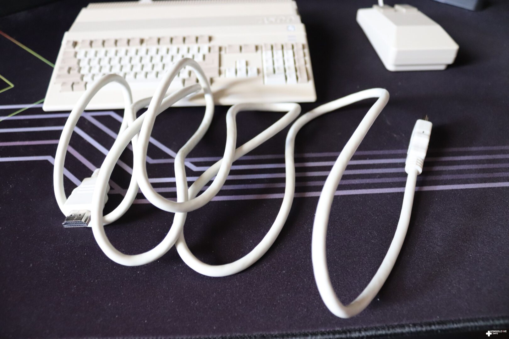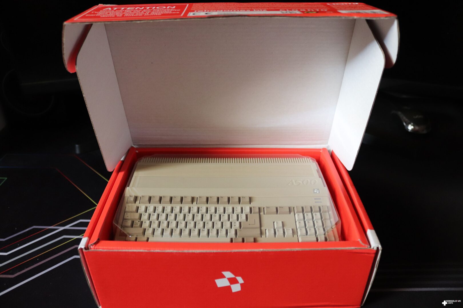 Zawartość opakowania wygląda na pierwszy rzut oka dość standardowo. Mamy bowiem oczywiście samą konsolkę THEA500 Mini. Należy jednocześnie zaznaczyć, że jest ona skrywana pod kawałkiem przezroczystego plastiku, przypominającym klasyczną szybkę. Sprawia to naturalnie bardzo pozytywne wrażenie i można przypomnieć sobie dawne czasy. Pod konsolą (oraz oczywiście prostą instrukcją podłączenia) znajdziemy jeszcze dwa mniejsze prostokątne, czerwone kartony. Są opisane symbolami kontrolerów – kanciastej myszki i pada. W tych opakowaniach są oczywiście te kontrolery, ale i kable, jakie wykorzystamy do podłączania. Warto zauważyć, że przewody mają – tak samo jak wspomniane kontrolery i główna jednostka – charakterystyczne beżowe kolory, co sprawia bardzo przyjemne wrażenie.