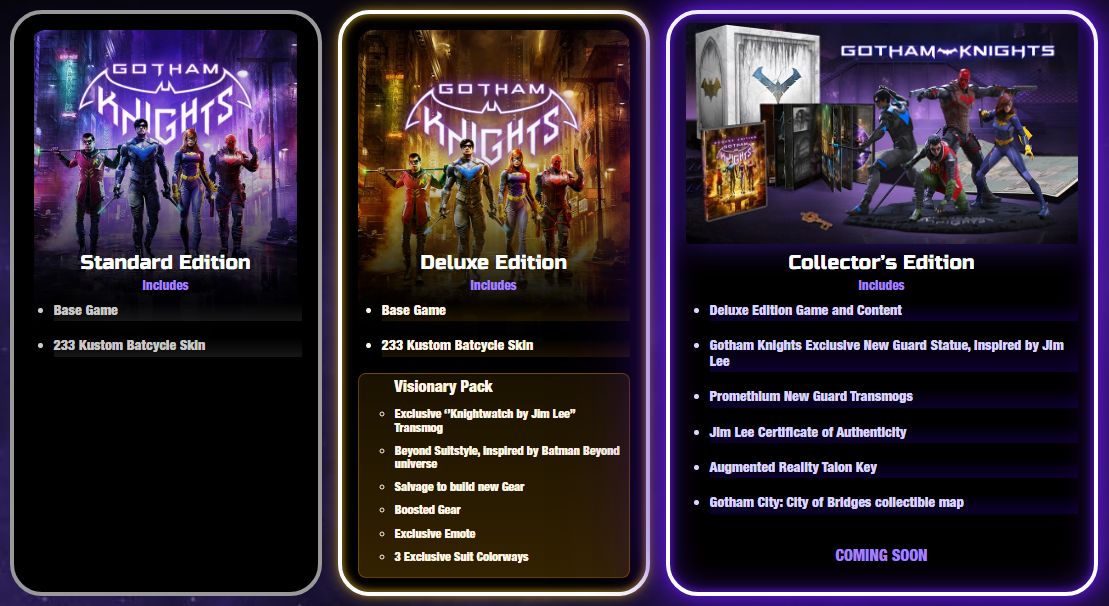 Jeżeli myśleliście, że to koniec informacji o Gotham Knights, to byliście w błędzie. Na stronie gry pojawiła się już bowiem możliwość składania zamówień przedpremierowych. Okazuje się, że tytuł będzie dostępny aż w trzech wersjach – jedną z nich jest oczywiście Edycja Kolekcjonerska! Niżej możecie się przyjrzeć zestawieniu tych wydań: