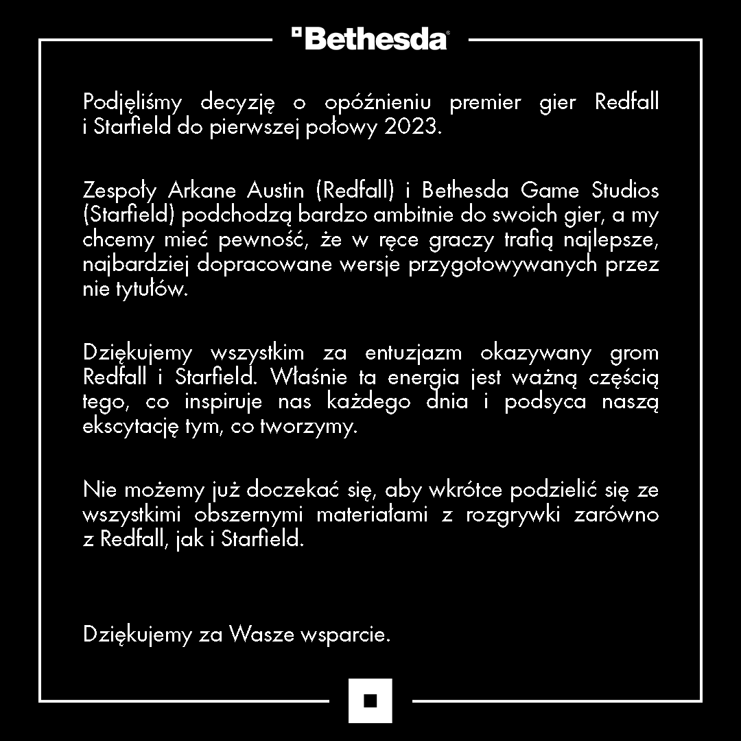 Bethesda ogłosiła właśnie, że Redfall i Starfield zaliczą sporawe opóźnienie. Obie gry mają ukazać się teraz w pierwszej połowie 2023.