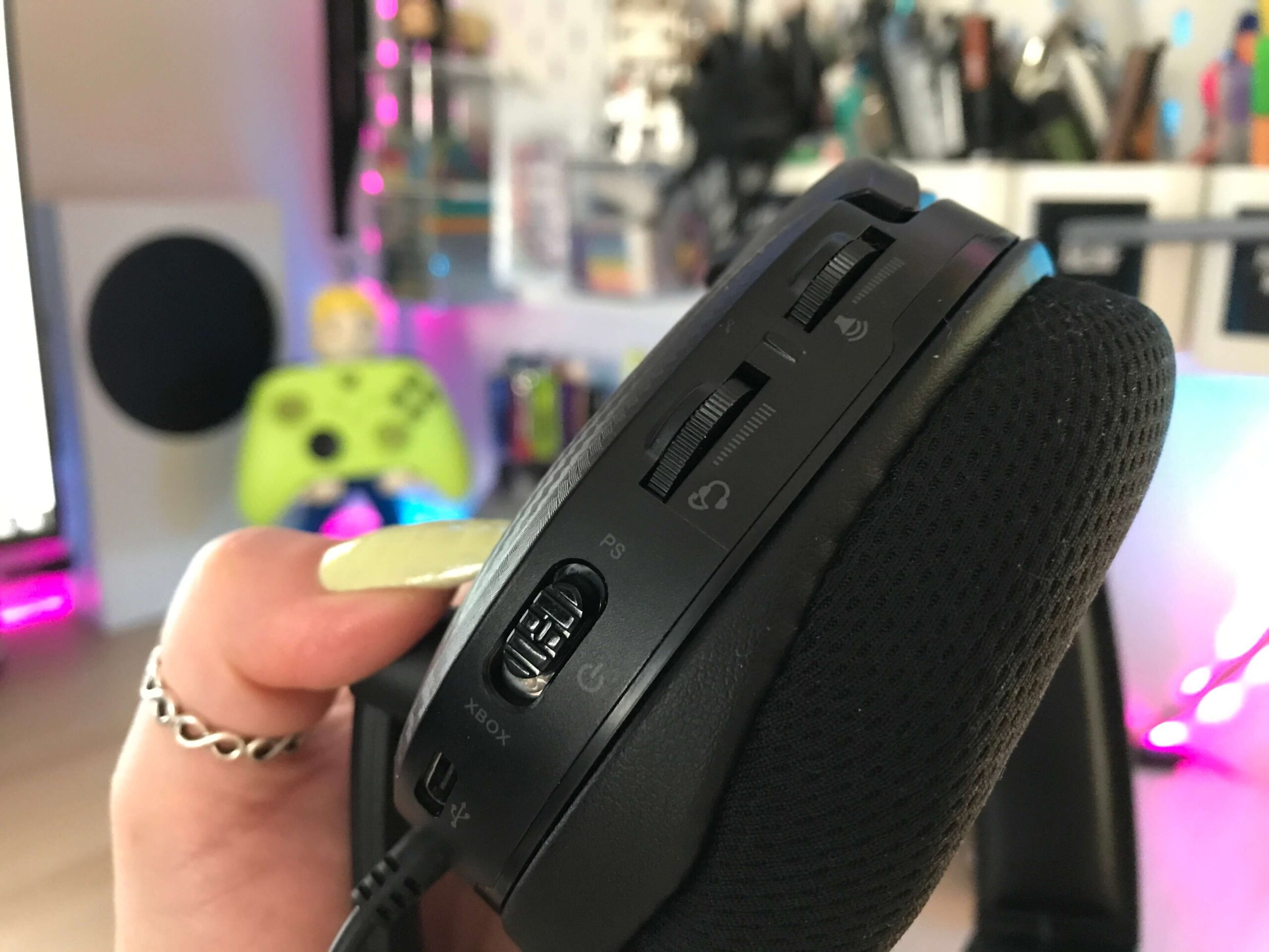 Na lewym nauszniku znajdziemy pokrętła do sterowania głośnością oraz wyciszaniem tła zbieranego przez mikrofon. Oprócz tego jest też przełącznik pomiędzy PlayStation, a Xboxem, a także… gniazdo USB-C służące do ładowania.